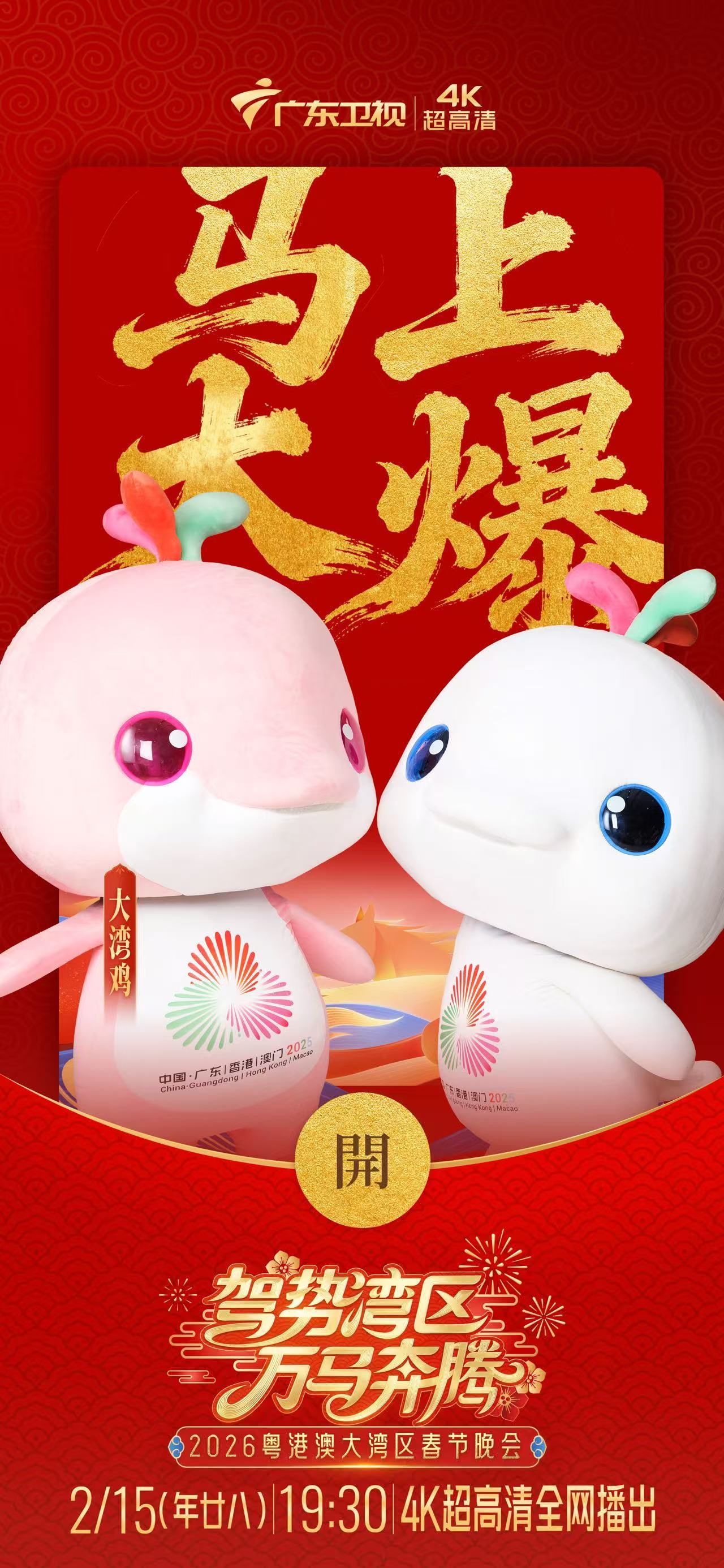 2月15日(年廿八)晚7:30,广东卫视《驾势湾区 万马奔腾——2026粤港澳大湾区春节晚会》将在广东卫视4K超高清频道及全网播出。