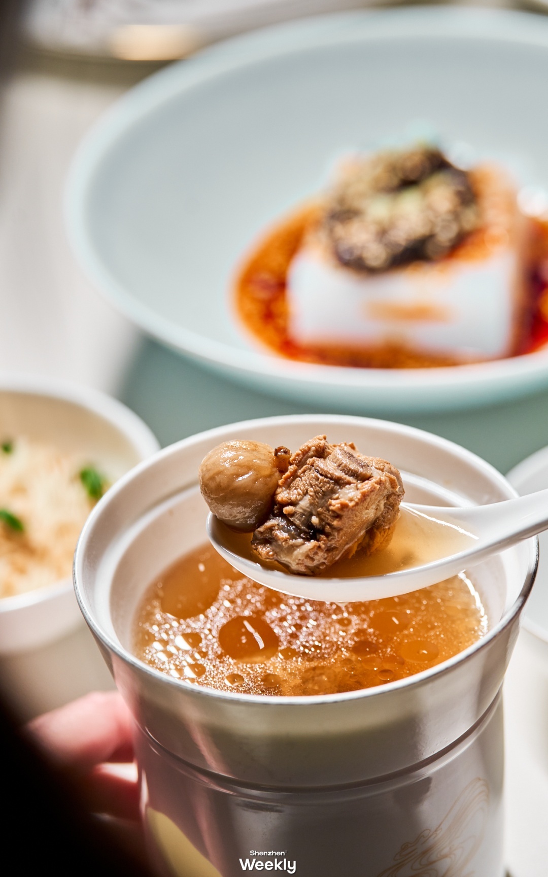 「春在堂」主打新派粤菜和手工点心,推荐「藤椒虾饺皇」,晶莹剔透的外皮,内裹整颗鲜虾,口感弹牙清爽,是考验粤菜点心功底的一道经典。此外,还有豉汁蒸排骨、罗汉斋肠粉等,都是老广最爱。
