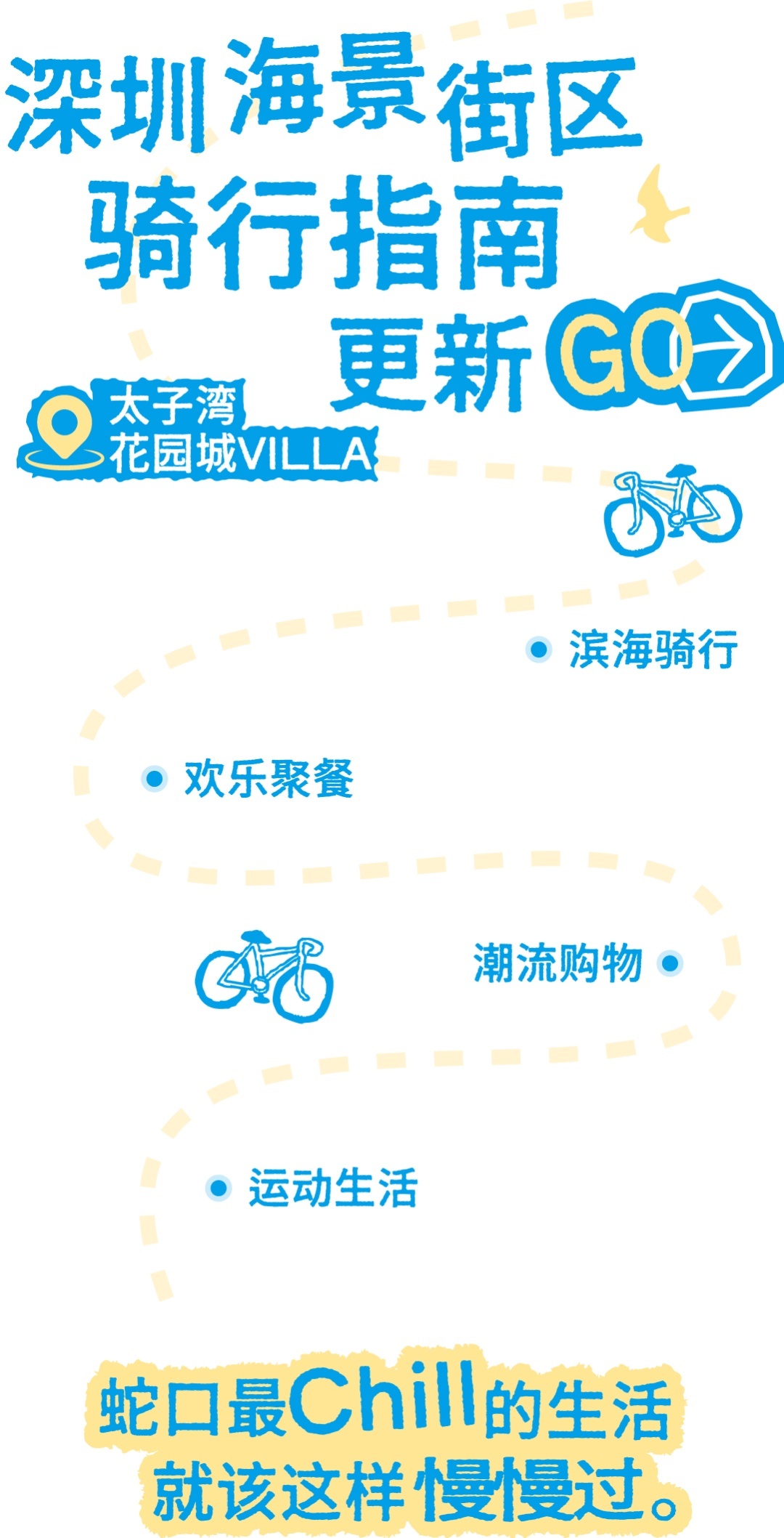 蛇口有不少适合慢骑的路线,团团私心想推荐它——从太子湾滨海岸线公园出发,顺着海的方向一路向西,目的地自然落在太子湾花园城VILLA。