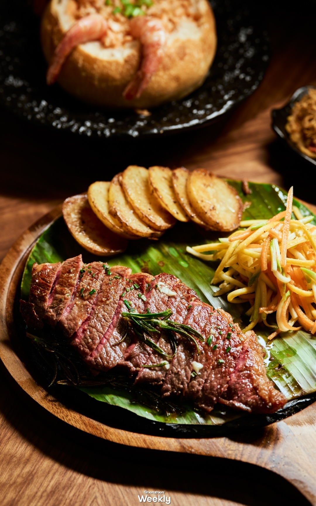 店内采用开放式厨房,可以看到主厨现场料理;在这里能吃到多款地道的拉美菜品:熔岩虾茸面包碗、臀腰肉盖和牛以及帕塔科拼盘,在这里就能尝试到各国别具一格的味觉体验。待夜幕降临后,现场演奏的拉丁音乐直接将氛围感拉满。