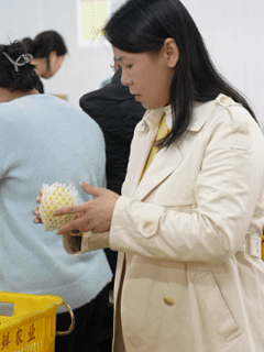 吴姨是一线的生鲜分拣员,家里种着几亩地,不仅结的果子卖来创鲜,自己也在这里打一份工,她说“家里挣,这里挣,都能挣”。