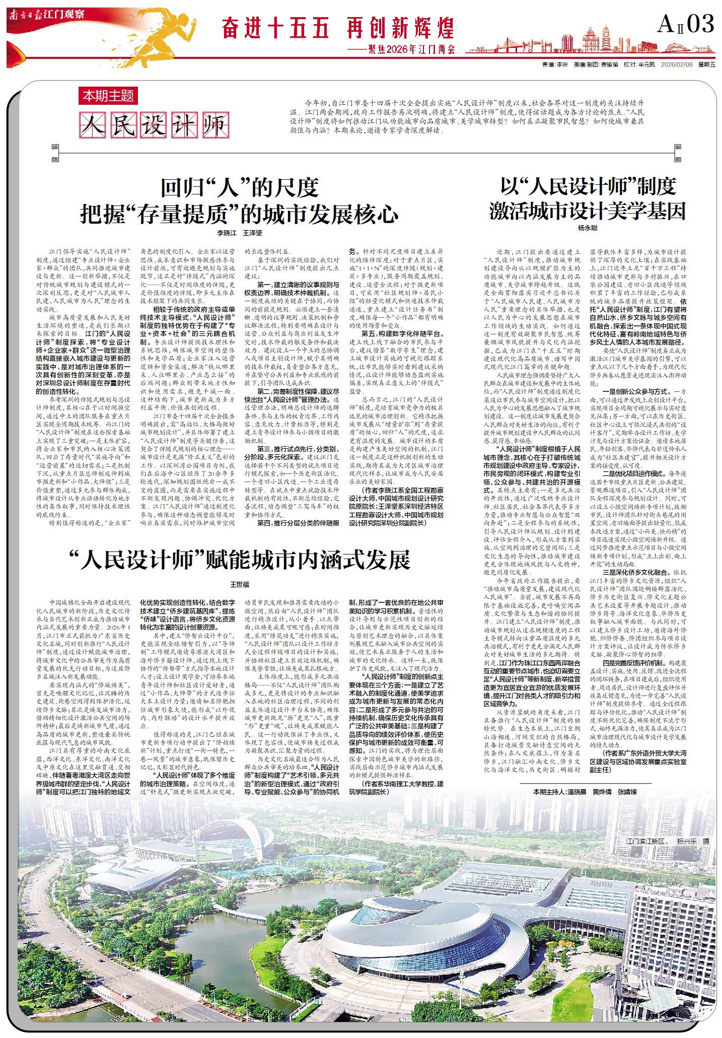 今年初,自江门市委十四届十次全会提出实施“人民设计师”制度以来,社会各界对这一制度的关注持续升温。江门两会期间,市政府工作报告再次明确,将建立“人民设计师”制度,将城市美学理念、侨乡文化内涵、岭南特色元素融入规划建设全过程,使得该话题迅速成为各方讨论的焦点。“人民设计师”制度将如何推动江门从功能城市向品质城市、美学城市转型?如何真正凝聚市民智慧?如何使城市兼具颜值与内涵?本期来论,邀请专家学者深度解读。