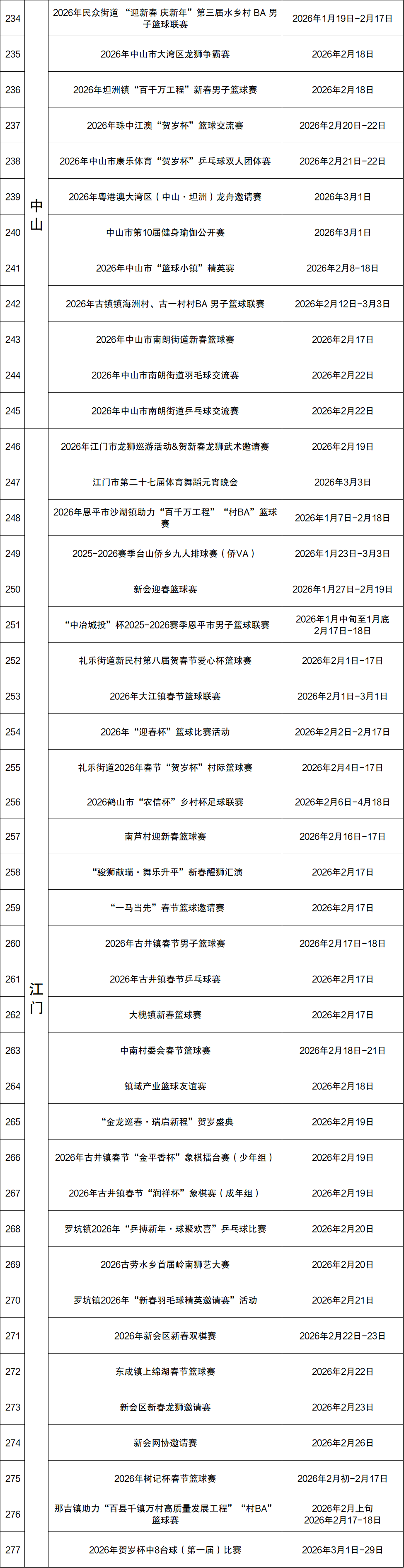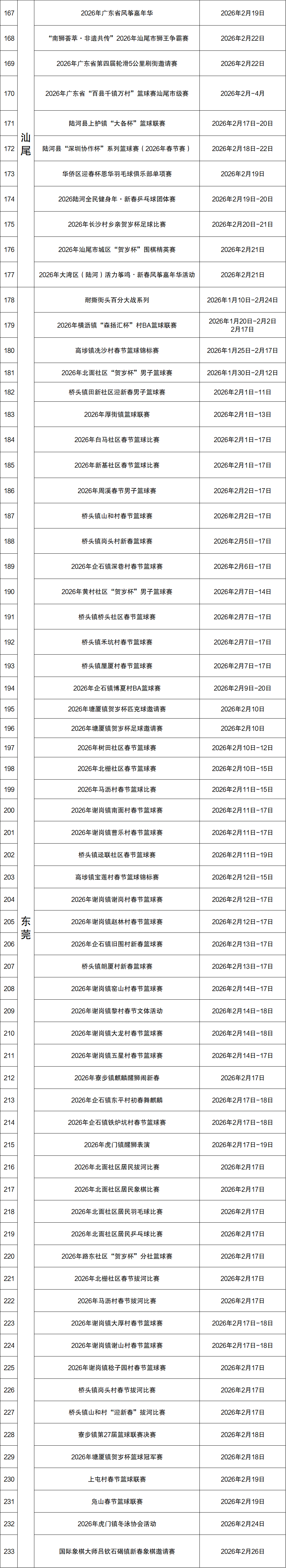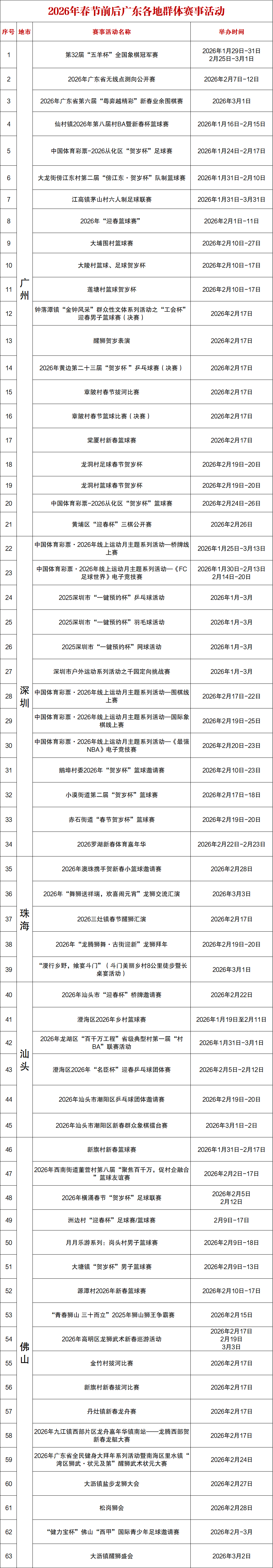 记者从广东省体育局获悉,为深入贯彻全民健身国家战略,丰富群众春节假期精神文化生活,营造喜庆祥和的新春氛围,广东省各地精心组织了一系列覆盖城乡、层级多元、特色鲜明的群众体育赛事活动。从城市场馆到乡村赛场,从线上云端到线下实景,让群众在运动中感受新春活力。