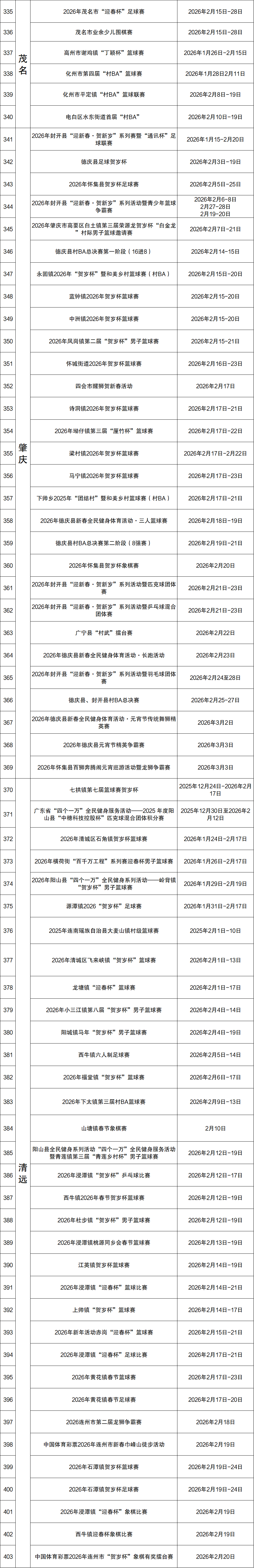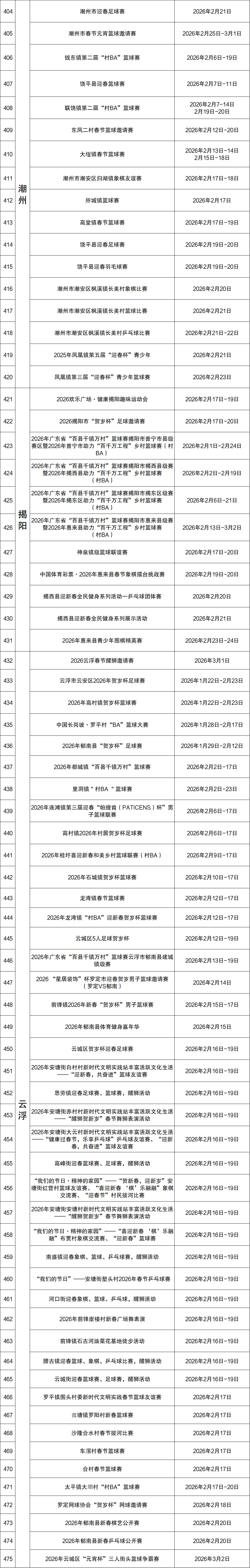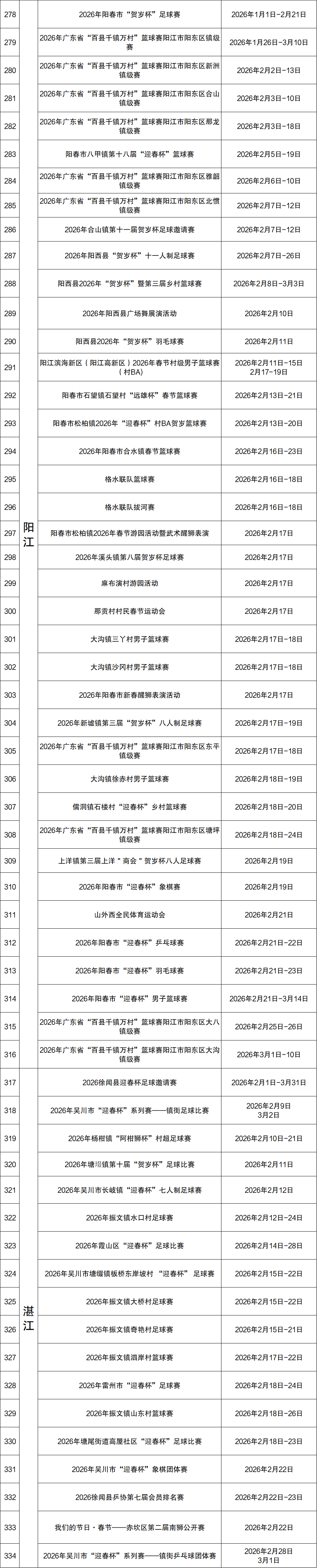 记者从广东省体育局获悉,为深入贯彻全民健身国家战略,丰富群众春节假期精神文化生活,营造喜庆祥和的新春氛围,广东省各地精心组织了一系列覆盖城乡、层级多元、特色鲜明的群众体育赛事活动。从城市场馆到乡村赛场,从线上云端到线下实景,让群众在运动中感受新春活力。