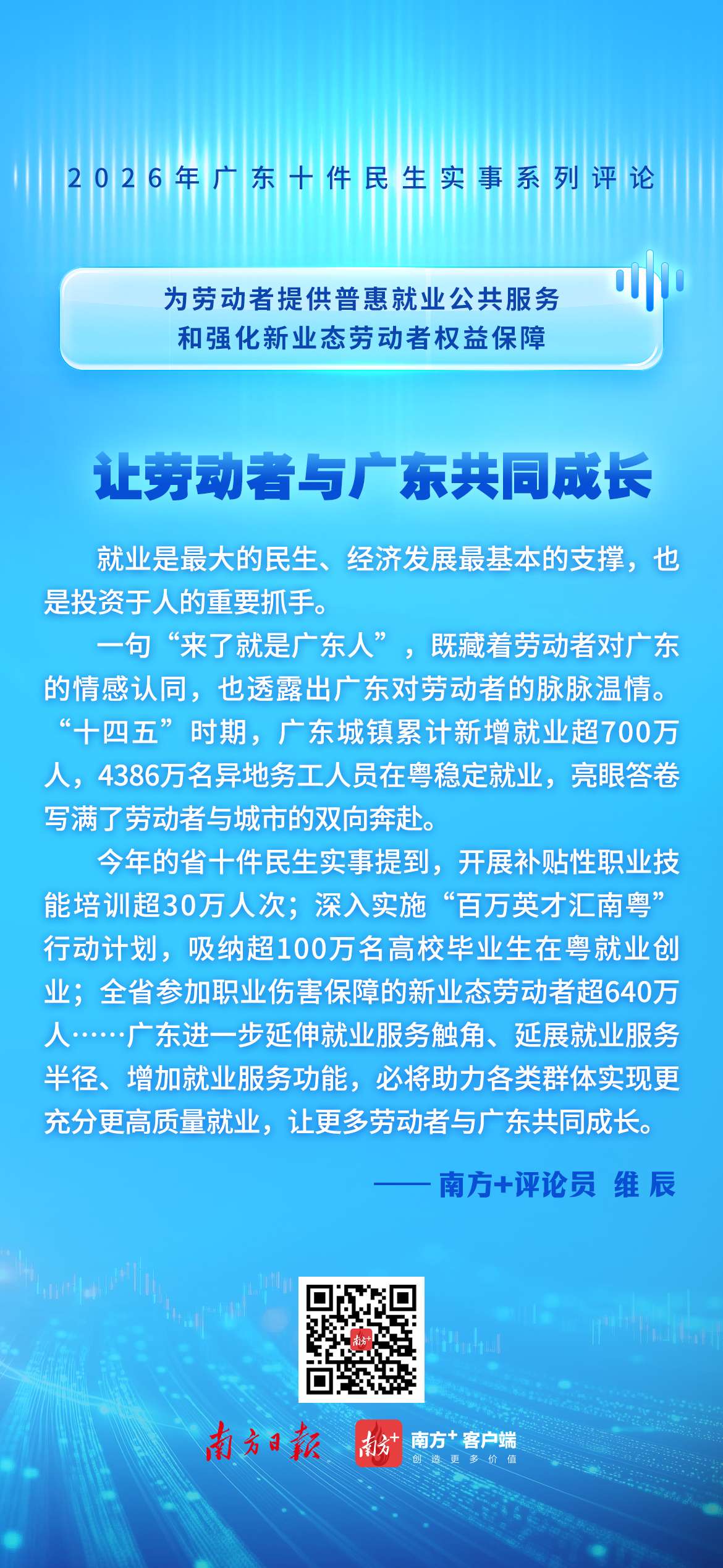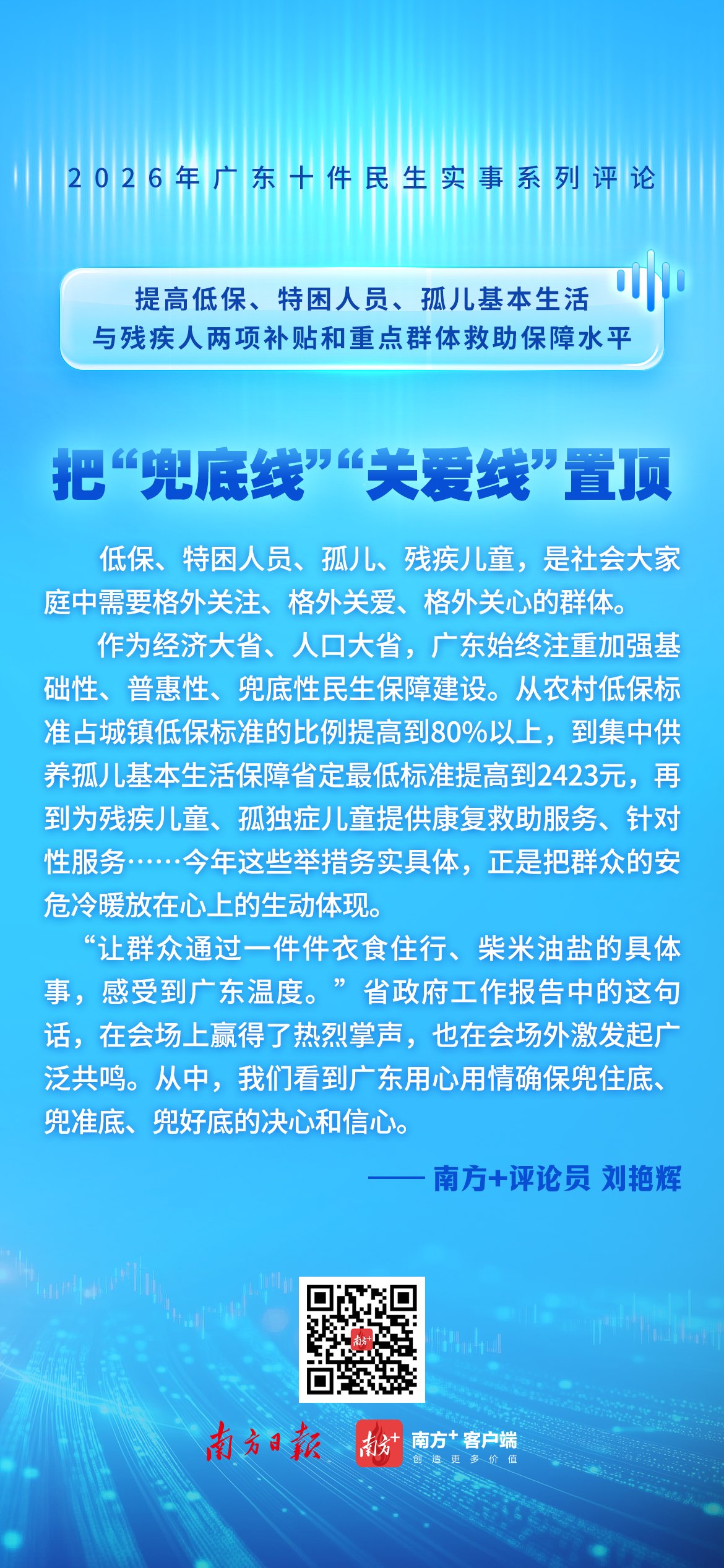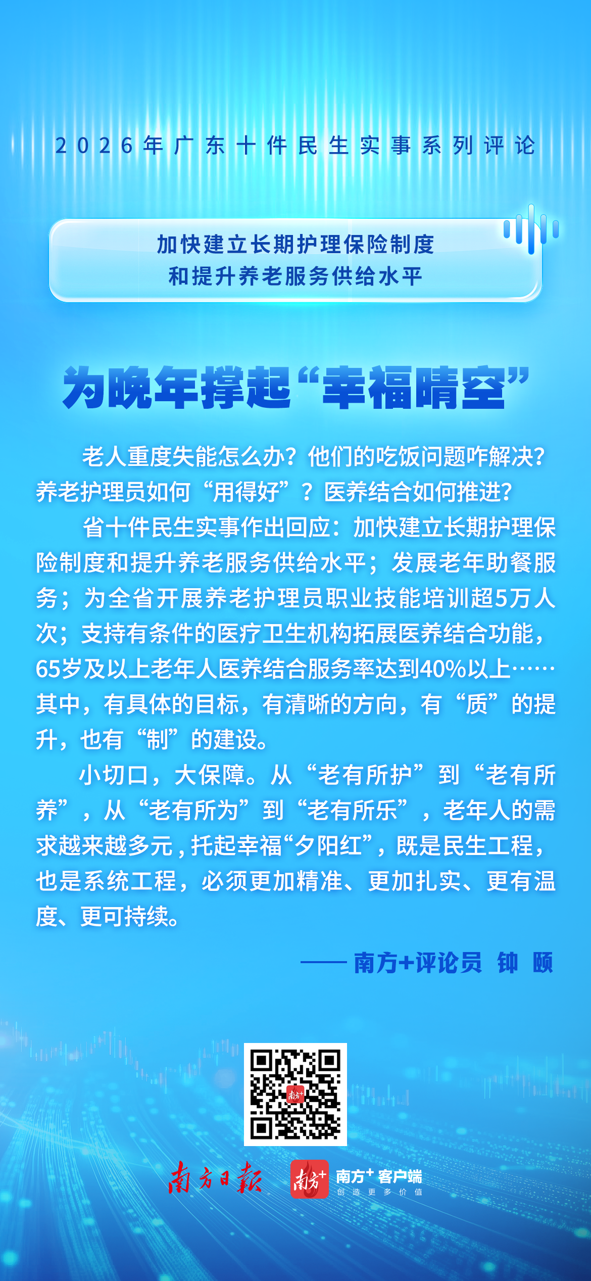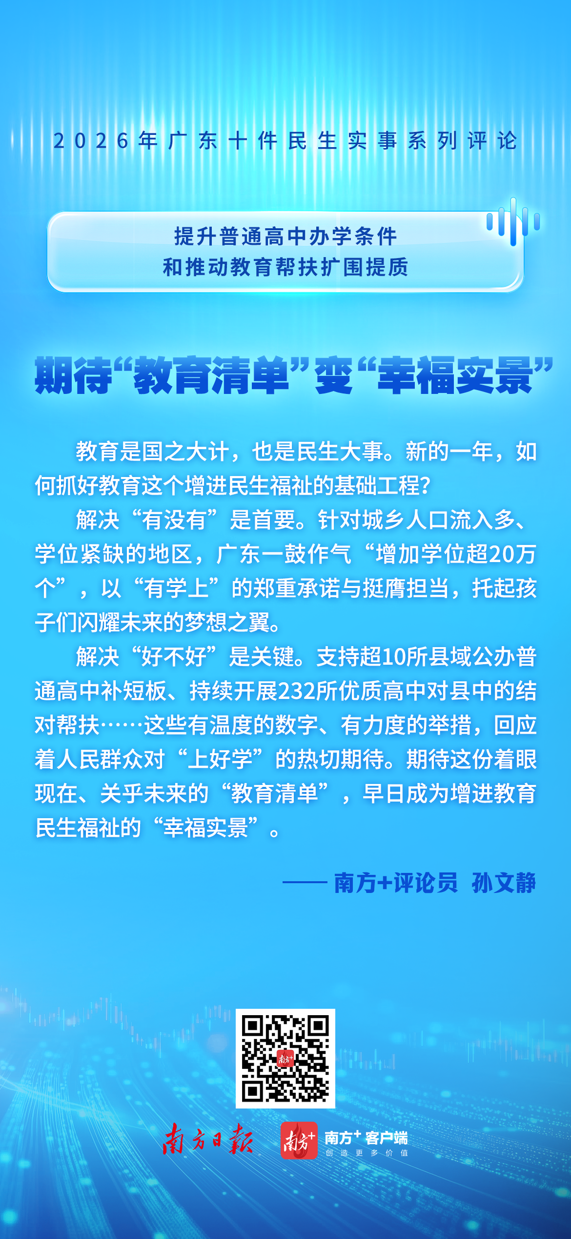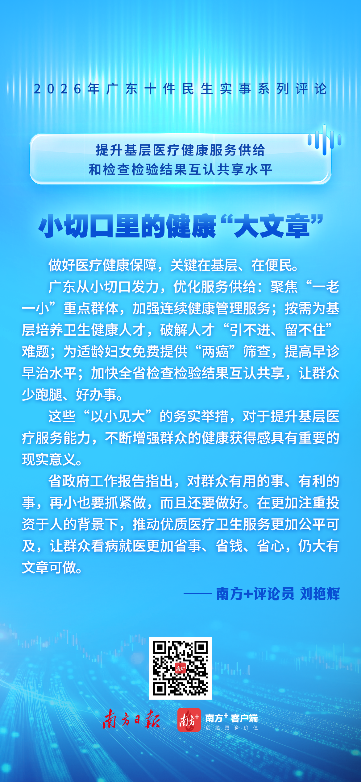近日,2026年广东省十件民生实事出炉,涵盖社会保障、教育、医疗、就业、生态等十大领域。南方+评论员推出系列评论,现集中刊发,以飨读者。统筹:丁建庭评论员:王庆峰 刘艳辉 孙文静 杨悦 高维 张宇驰 南方日报、南方+客户端原创,未经授权不得转载 编辑 麦小华校对 梁飞飞 订阅后可查看全文(剩余80%)