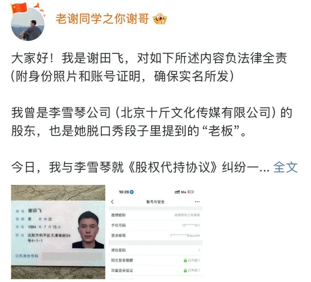 此外,对于谢田飞发布内容中的不实信息,李雪琴女士已依法取证,将保留采取下一步法律措施的权利。