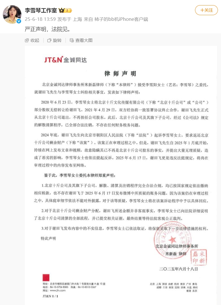 声明中提到:北京十斤公司及其旗下子公司,解散、清算及注销程序完全合法合规,均已按国家规定依法缴纳相应税款,也不存在谢田飞于2025年6月17日发布微博中所质疑的账务问题。因为该案仍在审理过程之中,具体庭审细节依法不能对外披露,对于该等质疑,李雪琴女士将在该案诉讼程序中予以具体回应。