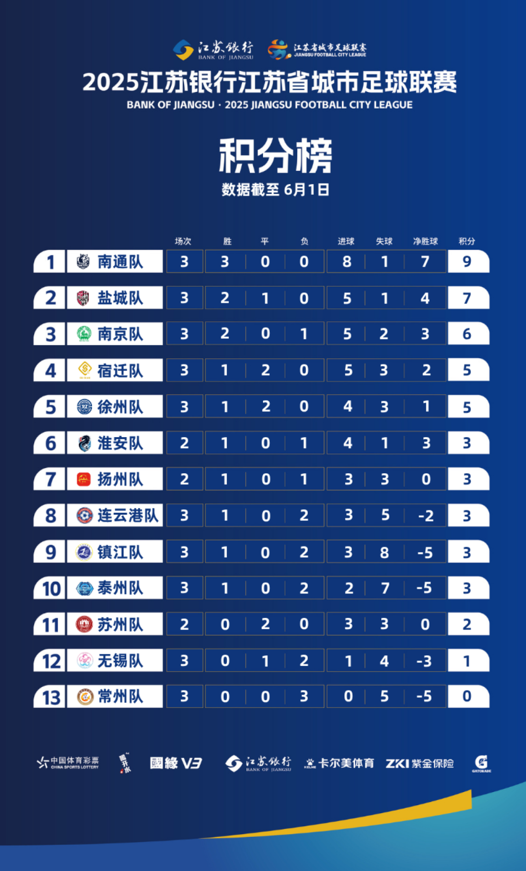 截至6月1日,2025江苏省城市足球联赛积分榜。(图/中国江苏网)