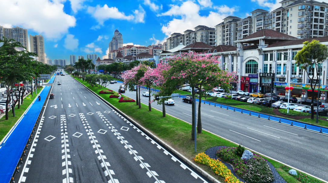 位于沙田镇的港口大道改造后,一条3米宽的“海洋蓝”非机动车道格外醒目