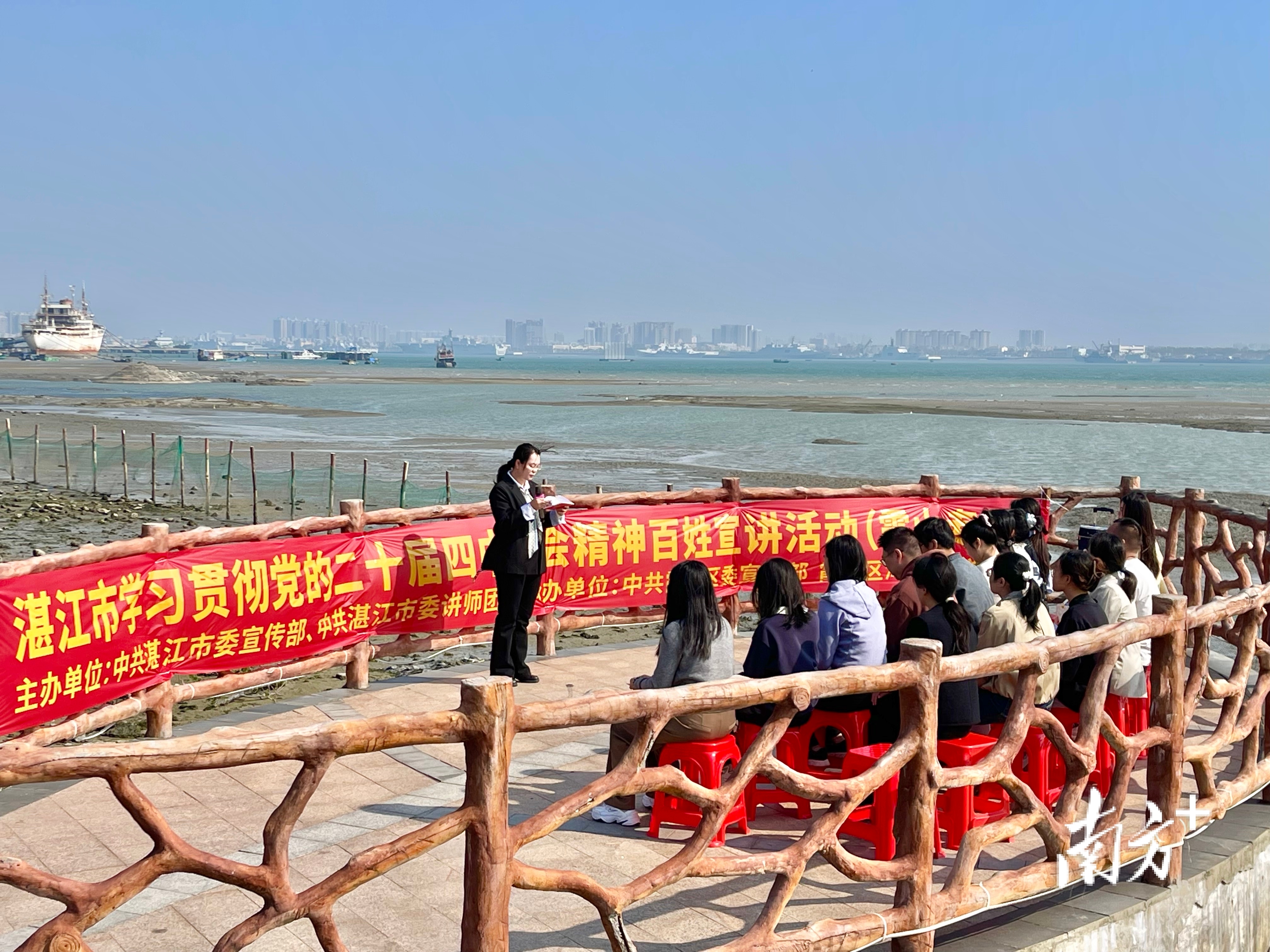 活动在宣讲员梁少思的文艺宣讲《鲜美湛江》粤曲中推向高潮。“浪花吻着白海豚,红土地上稻花香”的歌词,搭配湛江湾跨海大桥、徐闻菠萝的海等实景画面,将全会精神中“人与自然和谐共生”的理念转化为可感可知的视听体验。