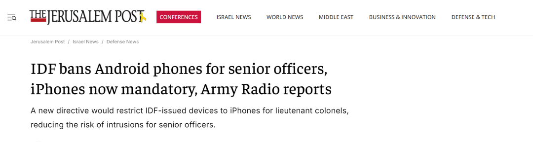 当地时间11月26日,据以色列陆军电台报道,以色列国防军将出台新规,禁止在军方配发的线路上使用安卓手机,并要求中校及以上军官统一使用苹果iPhone进行公务通信。此举旨在降低高级军官手机遭入侵的风险,强化信息安全。