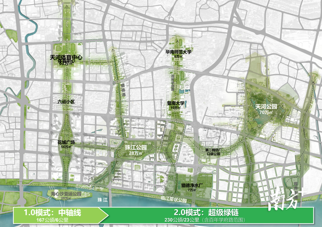 规划整体贯通23公里“超级城市绿链”,以马场为核心,北起暨南大学,南达猎德净水厂、临江带状公园,西连珠江公园、猎德涌、兴盛路商业街、花城广场,东至人工智能产业园、第二棉纺厂口袋公园、天河公园,打造连接天河CBD、珠江公园、马场、天河公园的4.5公里林荫步道,以及连接华农、华工、华师、暨大的6公里学府碧道。通过大面积绿廊和慢行连接,打开城市界面,形成连续的生态网络;与环五山高校园区延伸下来的百年学府文脉相承接,提升城市生态品质,塑造广州公共空间品质的2.0标杆,同时沿超级城市绿链,建设驿站、艺术小品、街角公园等公共空间,开展自行车停靠点、标识系统提升、城市家具提升等,提升公众获得感。