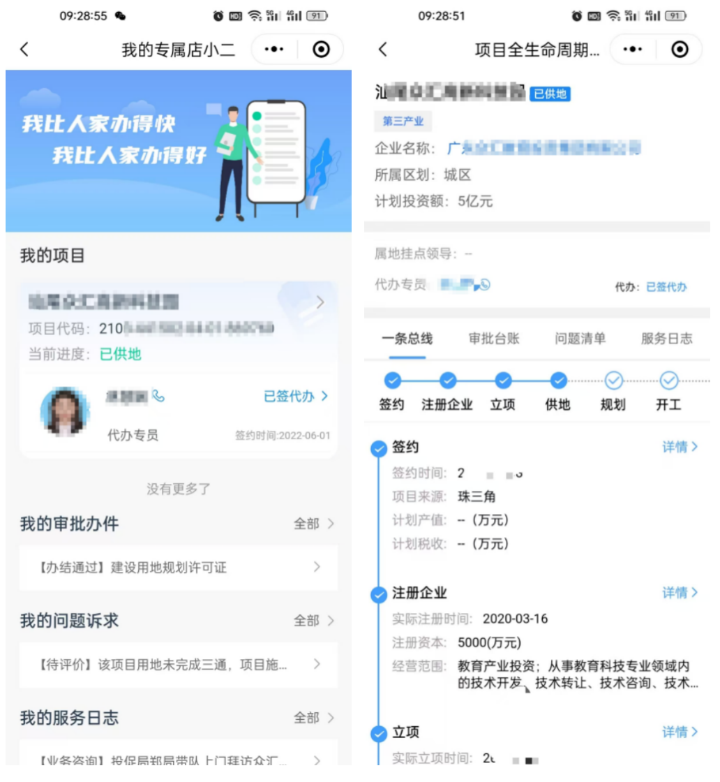 汕尾打通政数、投促、工信、市监、发改、住建、自然资源共7个单位业务数据,为企业提供进度查询、政策推送、审批申办、协调催办、跟踪反馈、服务评价等6大类服务。