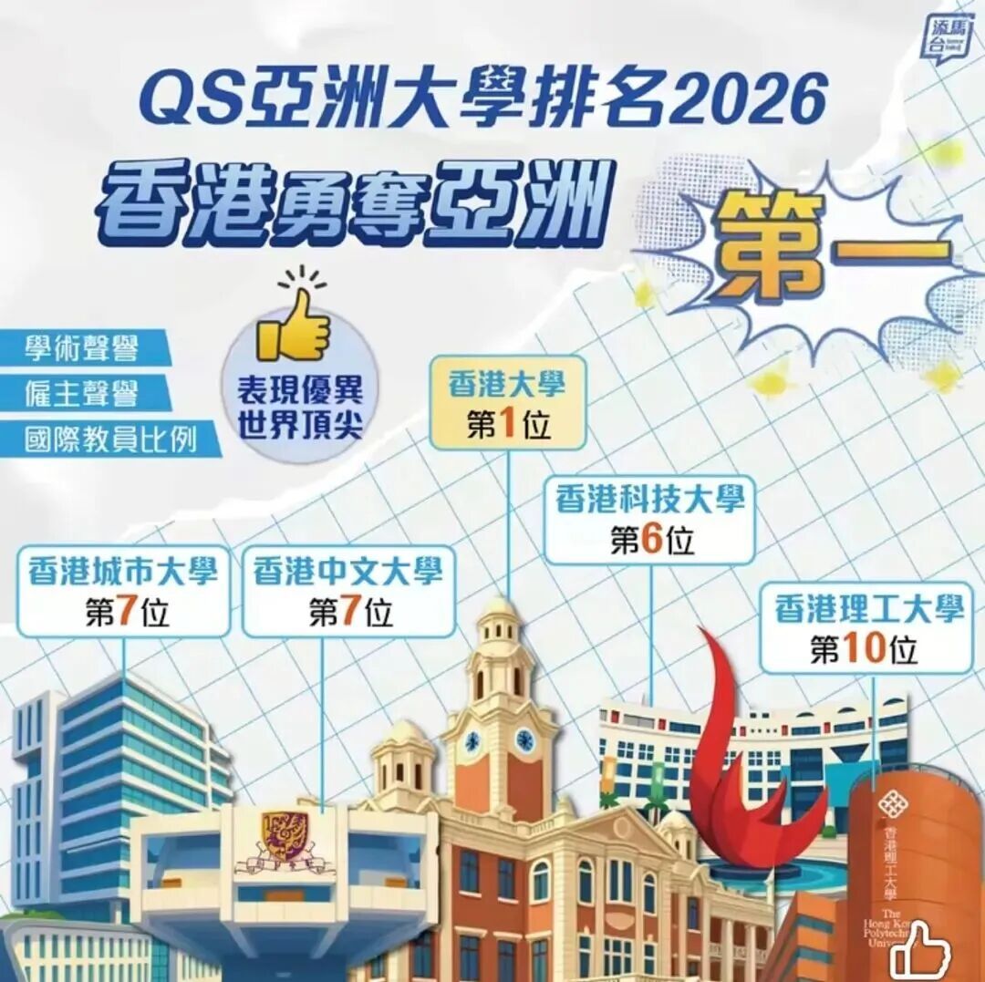 全球高等教育研究机构Quacquarelli Symonds(QS)11月4日发布“2026年QS世界大学排名:亚洲版”共1529所大学入围。其中,香港大学(港大)在阔别15年后,重返亚洲第一。包括港大在内,香港共有11所大学登榜,其中五所大学更跻身榜单前十。香港特区政府教育局局长蔡若莲表示,成绩充分体现香港高等教育的雄厚实力,也彰显特区政府相关措施的成效。