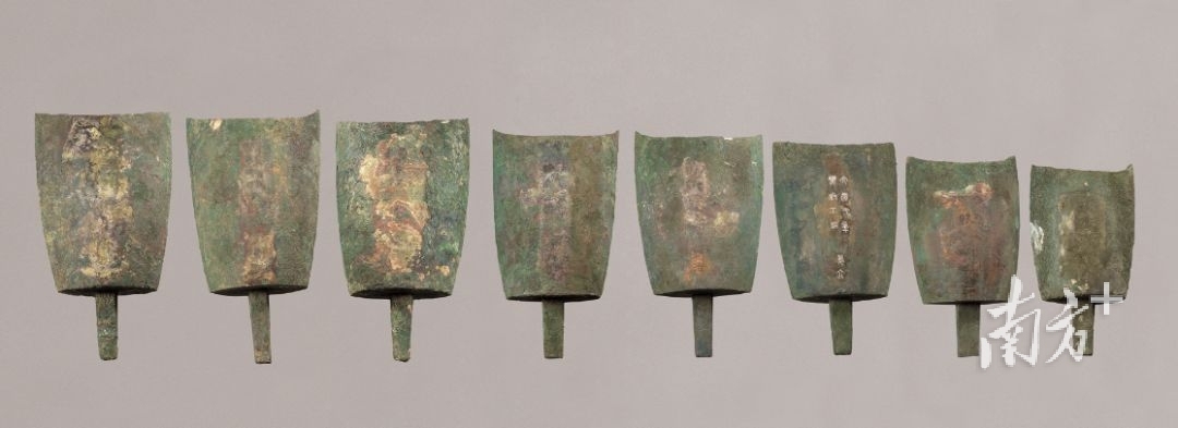 “这套铜句鑃是岭南地区首次发现如此大型的越族打击乐器。”王维一介绍,铜句鑃一套共8件,重191公斤,最大者通高64厘米,重40公斤;最小者通高36.8厘米,重10.75公斤。