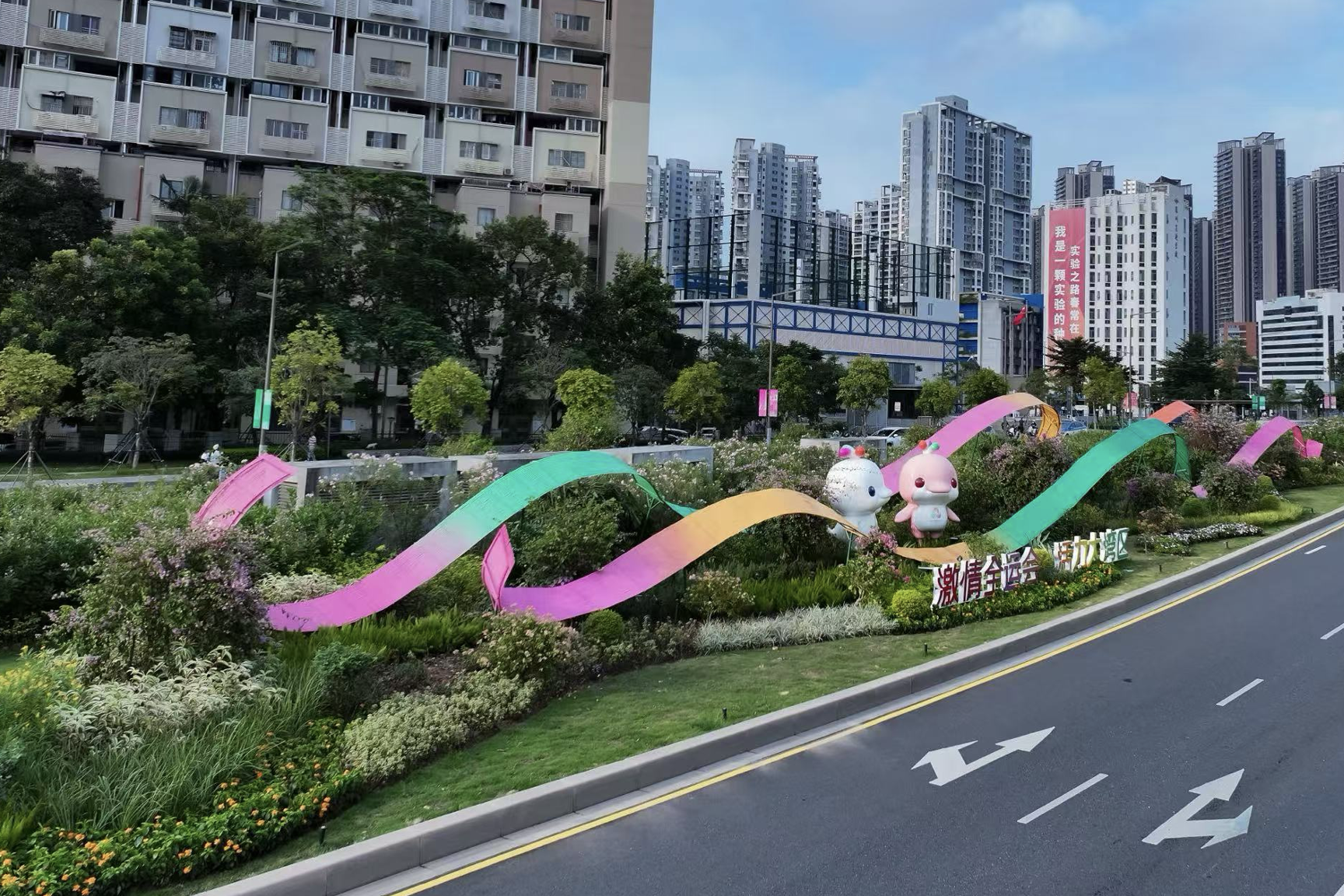 在北环大道、滨海大道、南坪快速路……赛事道旗、横幅随风招展,绿化花卉与吉祥物正组合成流动的风景线。