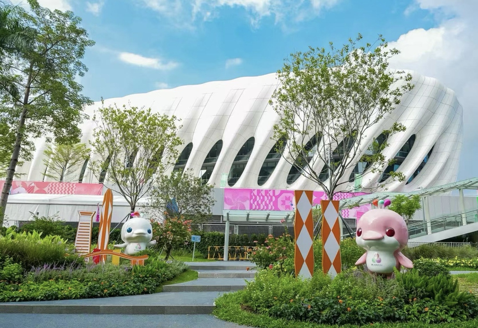 黄木岗隧道上方,灵动的“飘带”与奔涌的“海浪”竹编装置,将体育的韵律与深圳的海洋基因完美融合。场馆各出入口,赛事吉祥物与长效花境组成生动有趣的迎宾团。