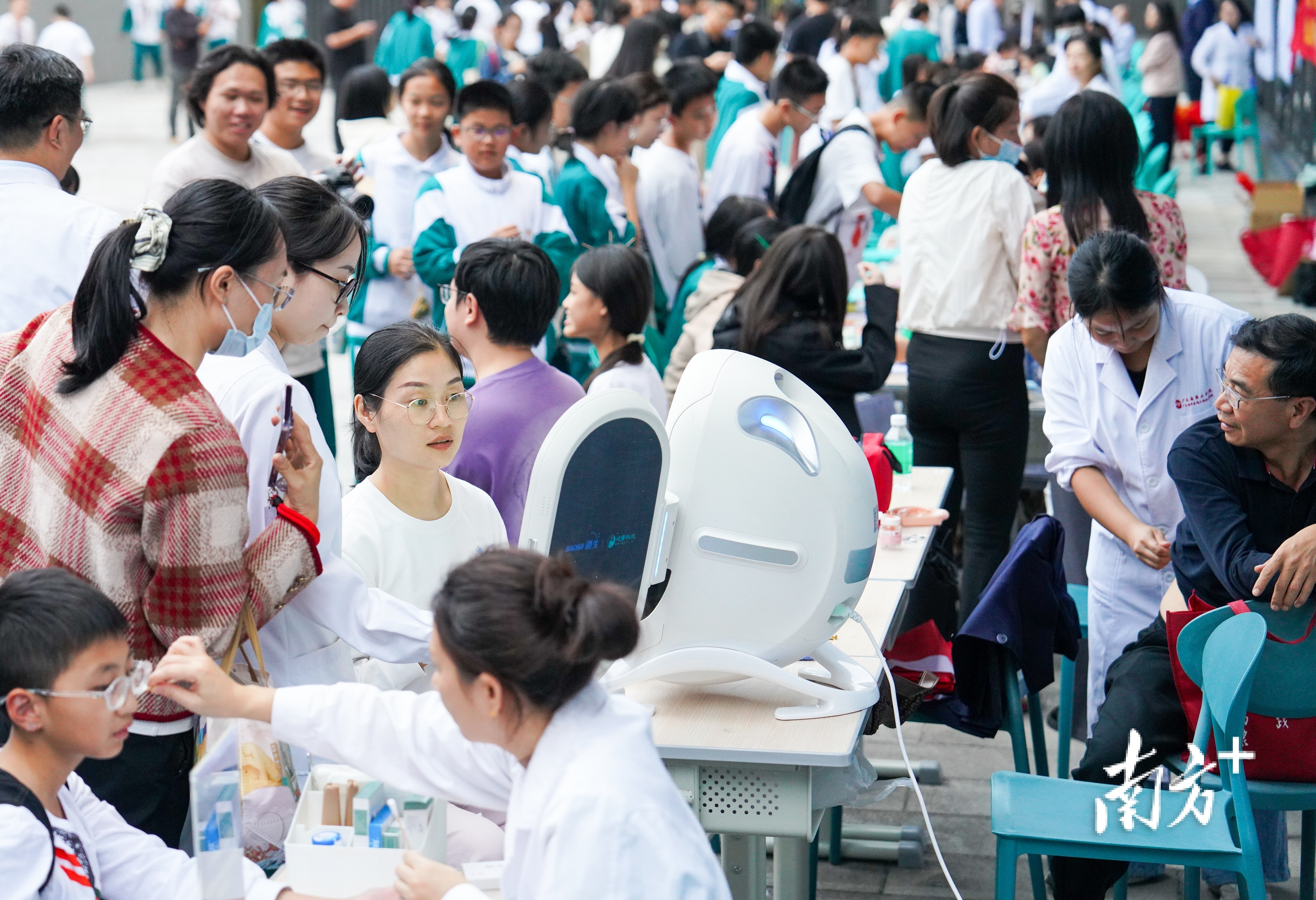 下午3时许,省实白云校区图书馆前广场上的义诊区逐渐热闹起来。广州中医药大学第一附属医院、广东省第二中医院等多家医院联合设置义诊点位,提供口腔检查、体态评估、生长发育咨询、心理健康疏导等服务,满足师生多样化的健康需求。