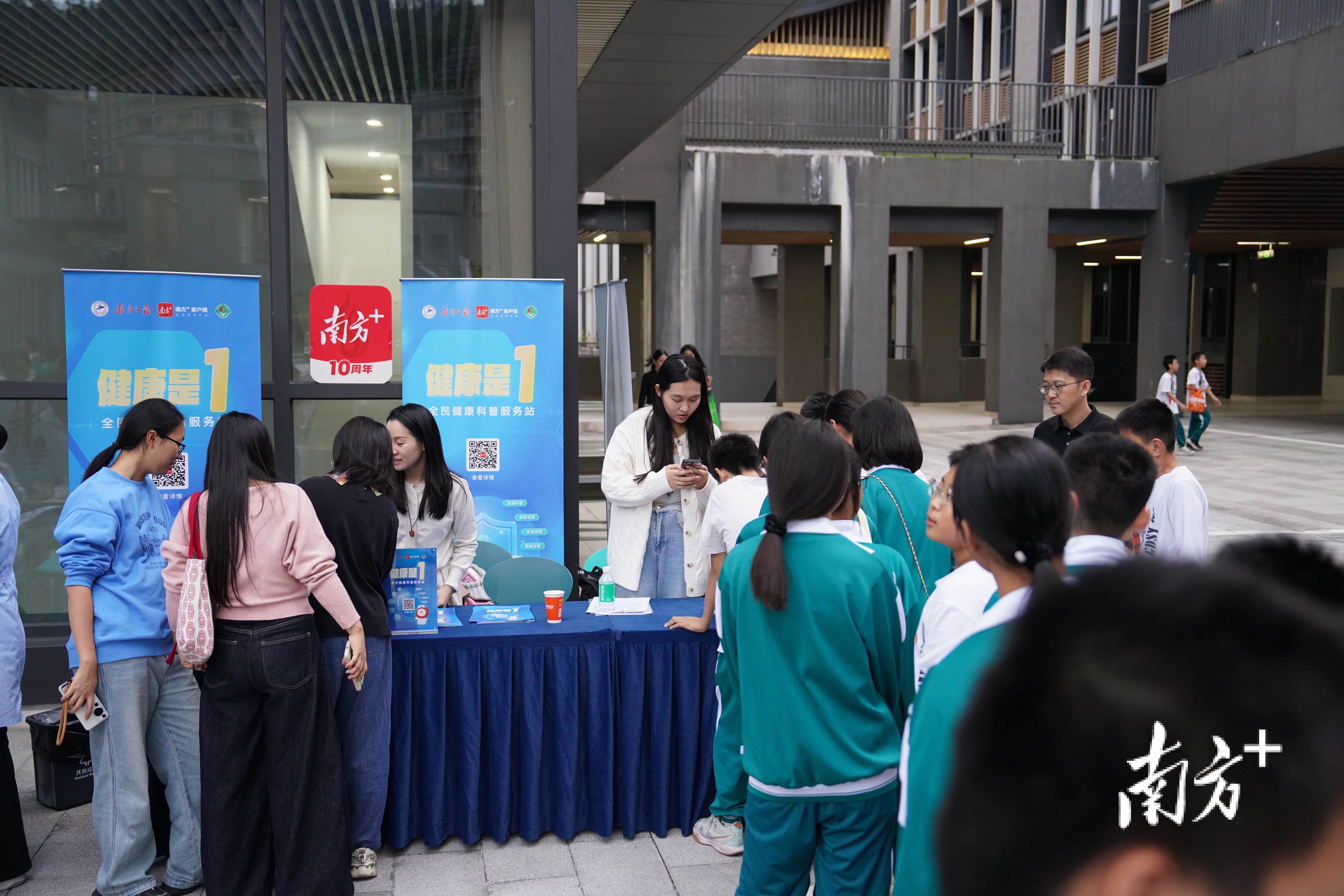 中山大学中山眼科中心派出5G移动眼科诊疗车,为师生提供视力筛查与干预服务。在南方+“健康是1”健康科普服务站,师生排起长队参与BMI体测或健康科普答题,完成体验后,他们还可获得十五运会周边等各种文体用品。