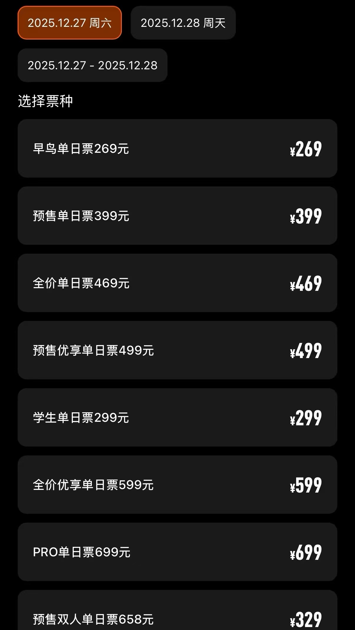 本次音乐节票种丰富,满足不同乐迷需求:早鸟单日票269元(限购1张)、学生单日票299元(25周岁以下全日制在校生需持学生证入场)、预售单日票399元、全价单日票469元。优享票与PRO票还附带专属权益,包括前排观演、优先入场、专属通道、官方饮品及周边折扣等,PRO票更有定制礼包、独立休息区、充电处等增值服务。此外,预售双人单日票、两日通票等优惠票种同步上线,为乐迷提供更多选择。