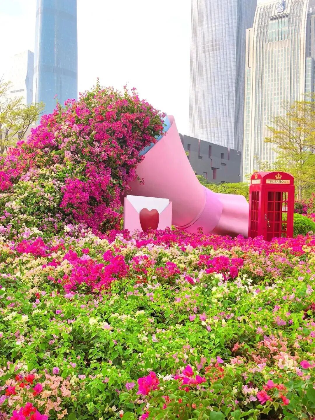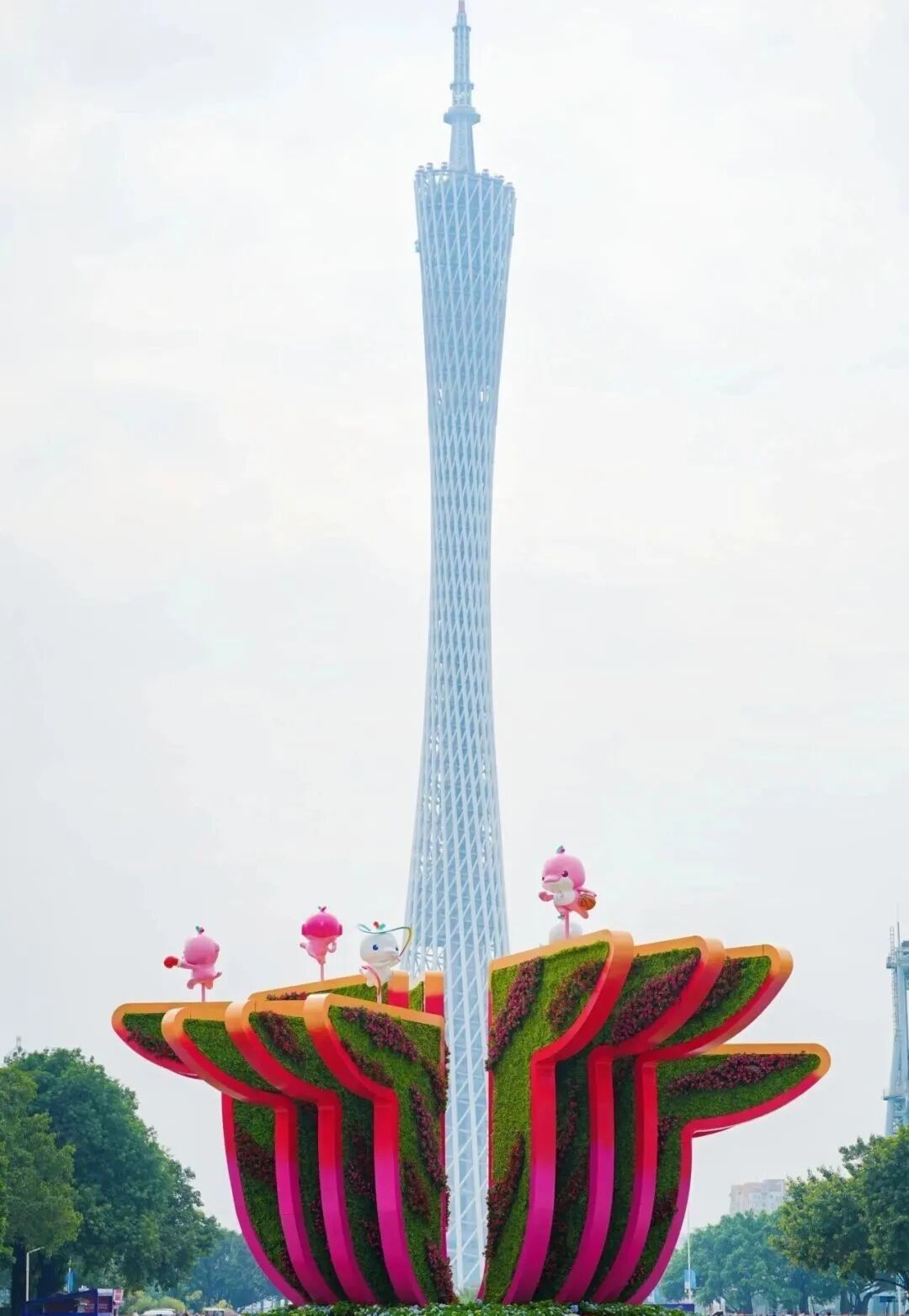 十五片线条利落的 “广” 字构件,巧妙拼出一朵巨型木棉花。找好角度对准镜头,广州塔会稳稳“嵌”进花芯中央,还能让“喜洋洋”“乐融融”两只萌物一起入镜!
