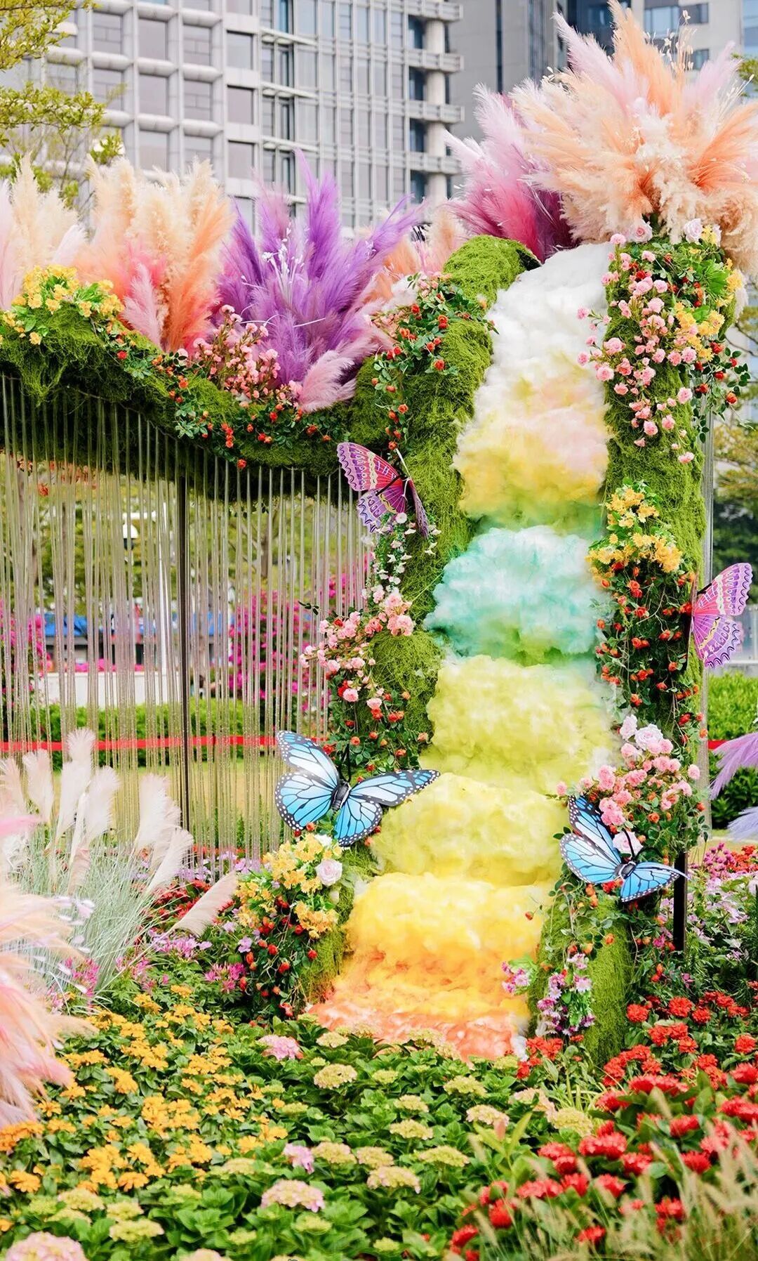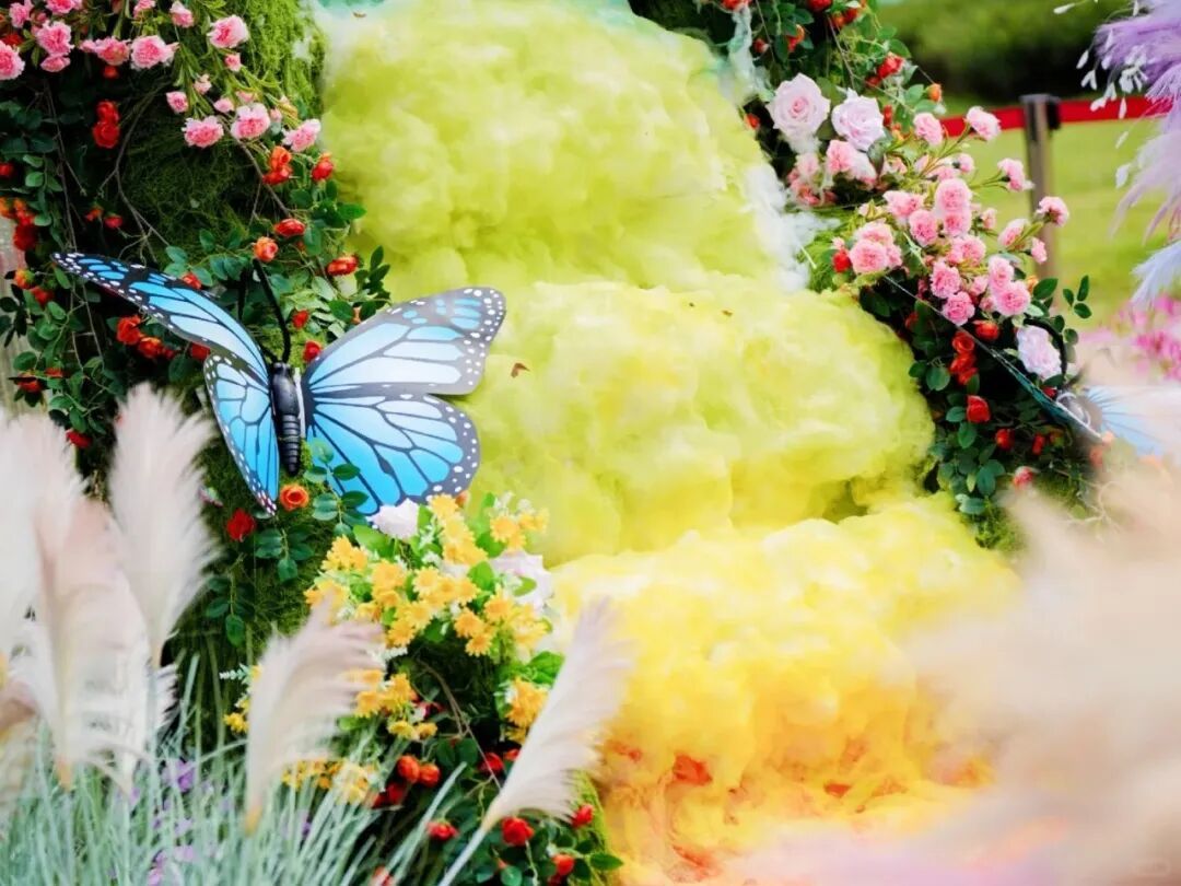 七彩花簇顺着阶次层层铺展,像把烟花炸开的绚烂瞬间被稳稳定格。蝴蝶绕着花丛翩跹起舞,每一帧都像闯进童话里~