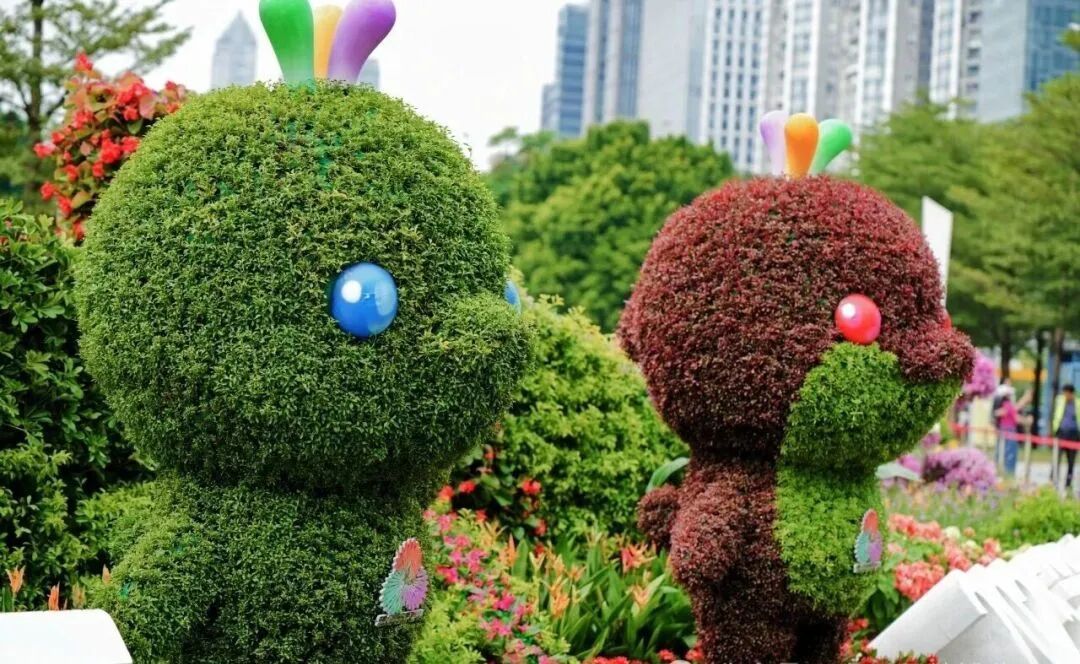 从临江大道步行至海心沙3号桥,即可到达全运花园,历届吉祥物变身绿植限定款!排排站可爱到想rua!