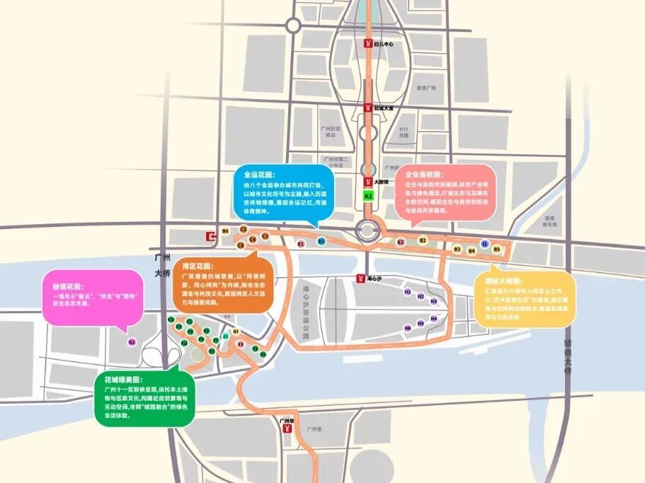 注:天河区&番禺区绿美园位于二沙岛艺术公园,可前往游览。