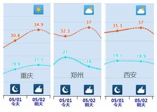 像是重庆、西安、郑州明天都可能出现高温,西安、郑州还可能冲击37℃。