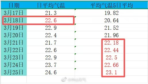 从3月21日至3月25日,中山市连续5天的5日滑动平均气温均≥22℃;构成3月21日的5日滑动平均气温中,3月18日的日平均气温达到22.6℃。
