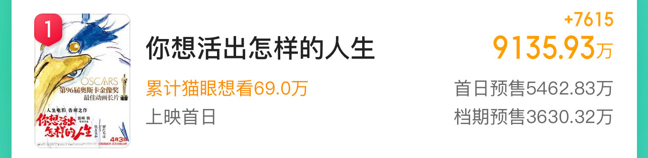 目前,宫崎骏新作、刚刚获得第96届奥斯卡最佳动画长片奖的《你想活出怎样的人生》以超9000万元的预售票房领跑清明档,并以高达85%的预售票房占比与其他影片拉开极大差距,似乎已经提前锁定清明档票房冠军。
