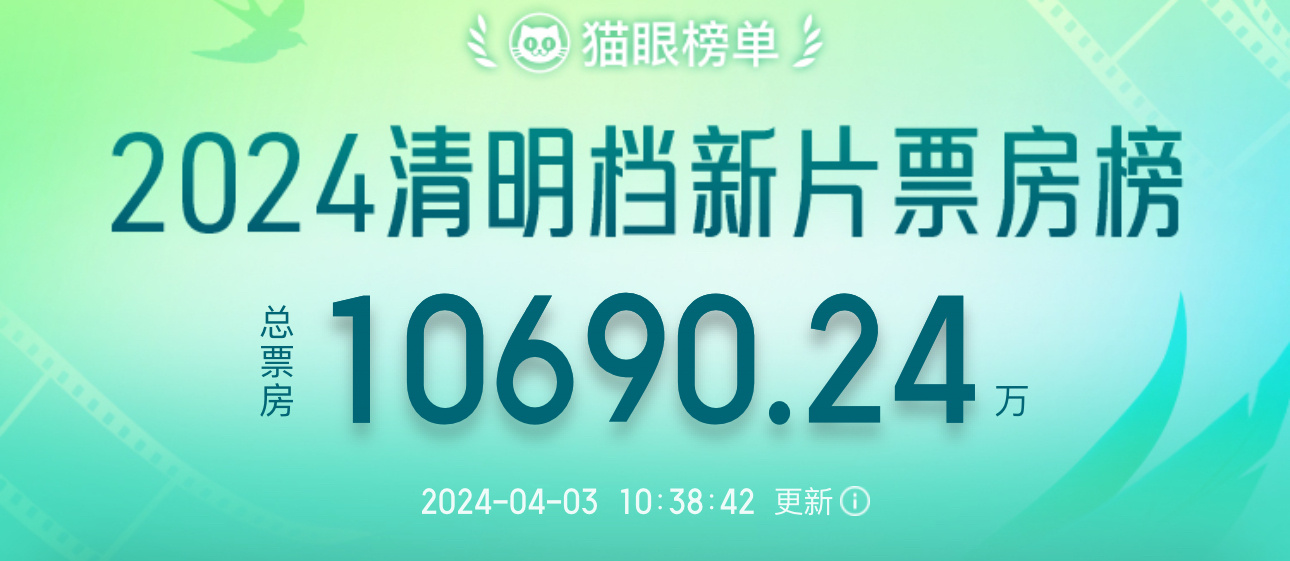 据猫眼专业版数据,截至4月3日,2024年清明档新片预售总票房已突破1亿元,数字还在持续上涨。而上映日历显示,共有8部新片定档2024年清明档,分别为《你想活出怎样的人生》《草木人间》《黄雀在后!》《大“反”派》《零度极限》《冰雪女王5:融冰之战》《雪豹》《午夜怪谈》。