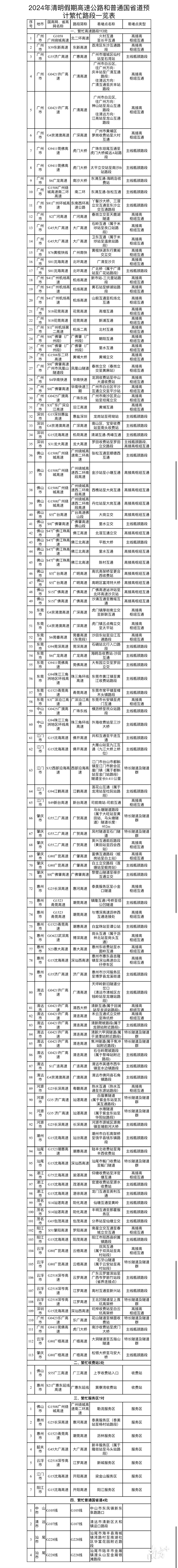 2024年4月3日,记者从广东省交通运输厅获悉,清明节假期(4月4日至6日)实施七座及以下小客车免收通行费政策。今年清明假期,广东高速公路以返乡祭祖、踏青出游车流为主,小型客车居多。