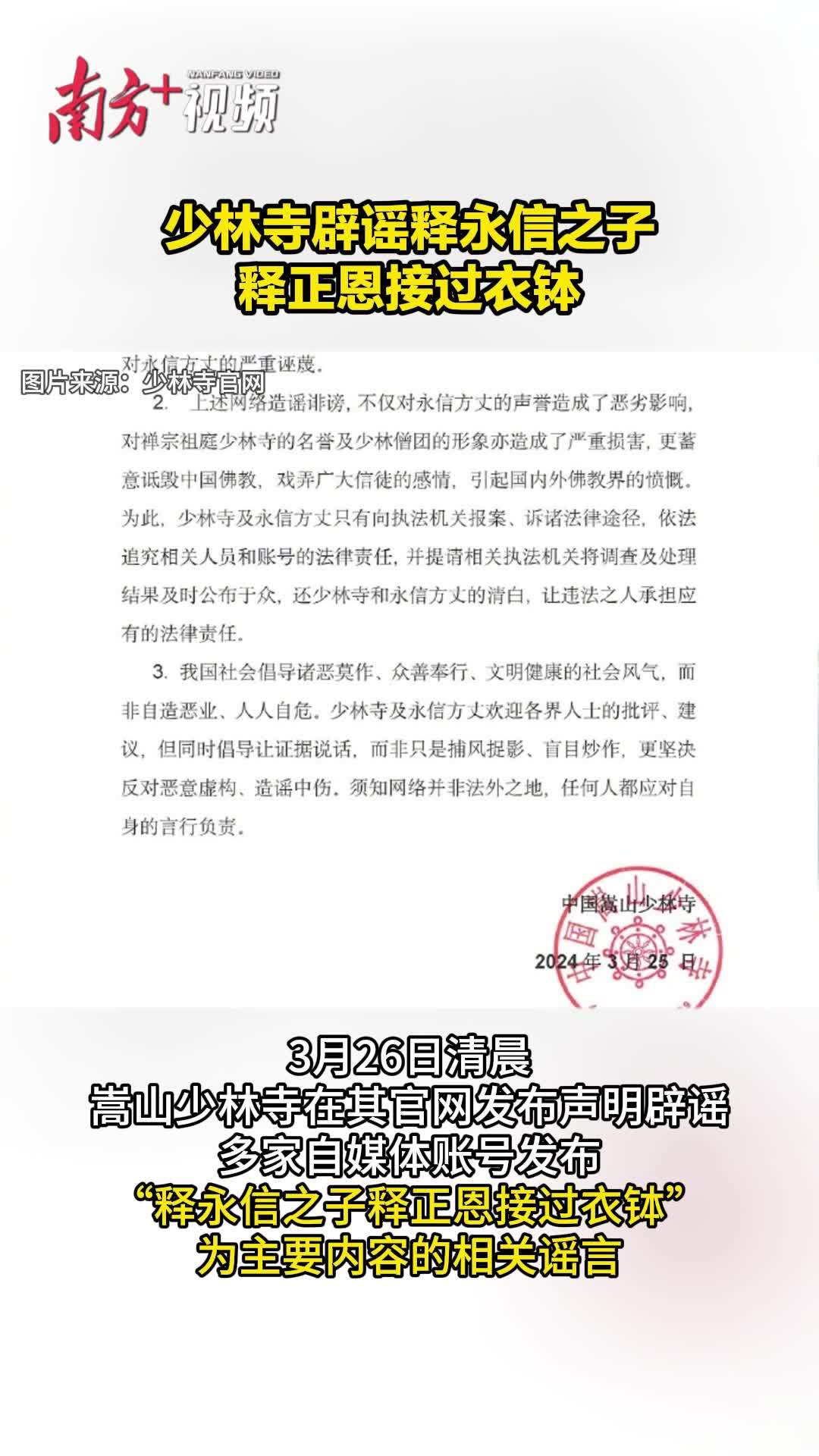 近日来,多家自媒体账号发布所谓“佛二代现身——释永信之子释正恩接过衣钵”为主要内容的相关谣言,经部分媒体转载后,在网络上迅速传播,造成恶劣影响现对此作如下声明: