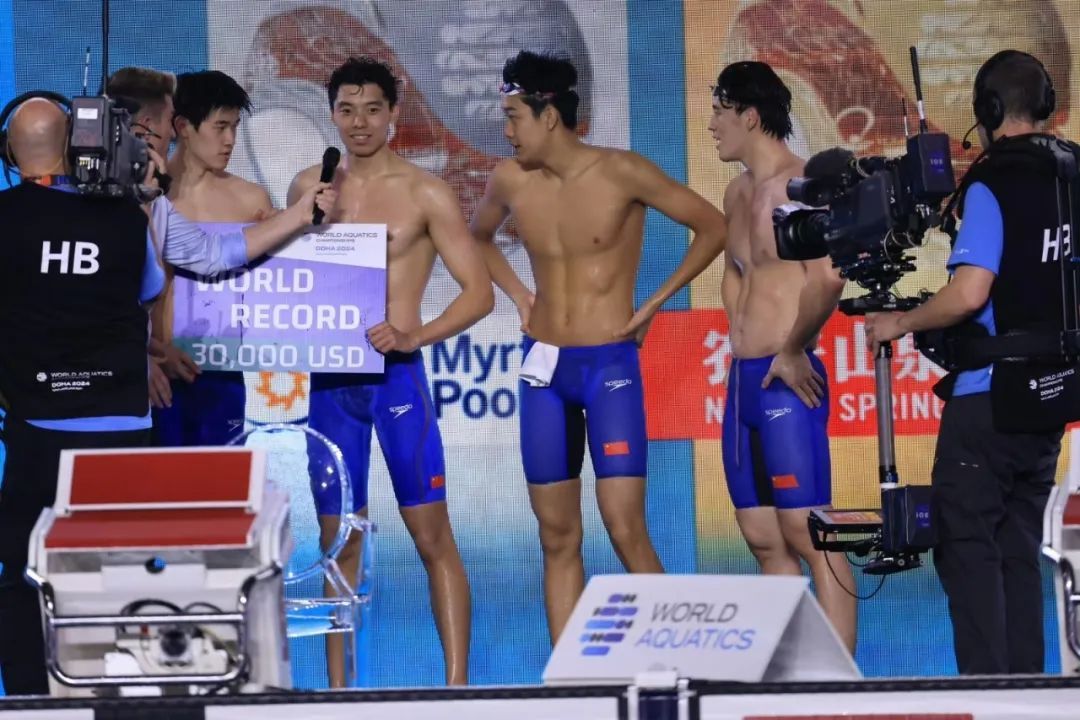 根据相应规则,接力比赛中第一棒选手的成绩可以向总裁判申请世界纪录,潘展乐也因此成为奥运年首个世界纪录创造者。