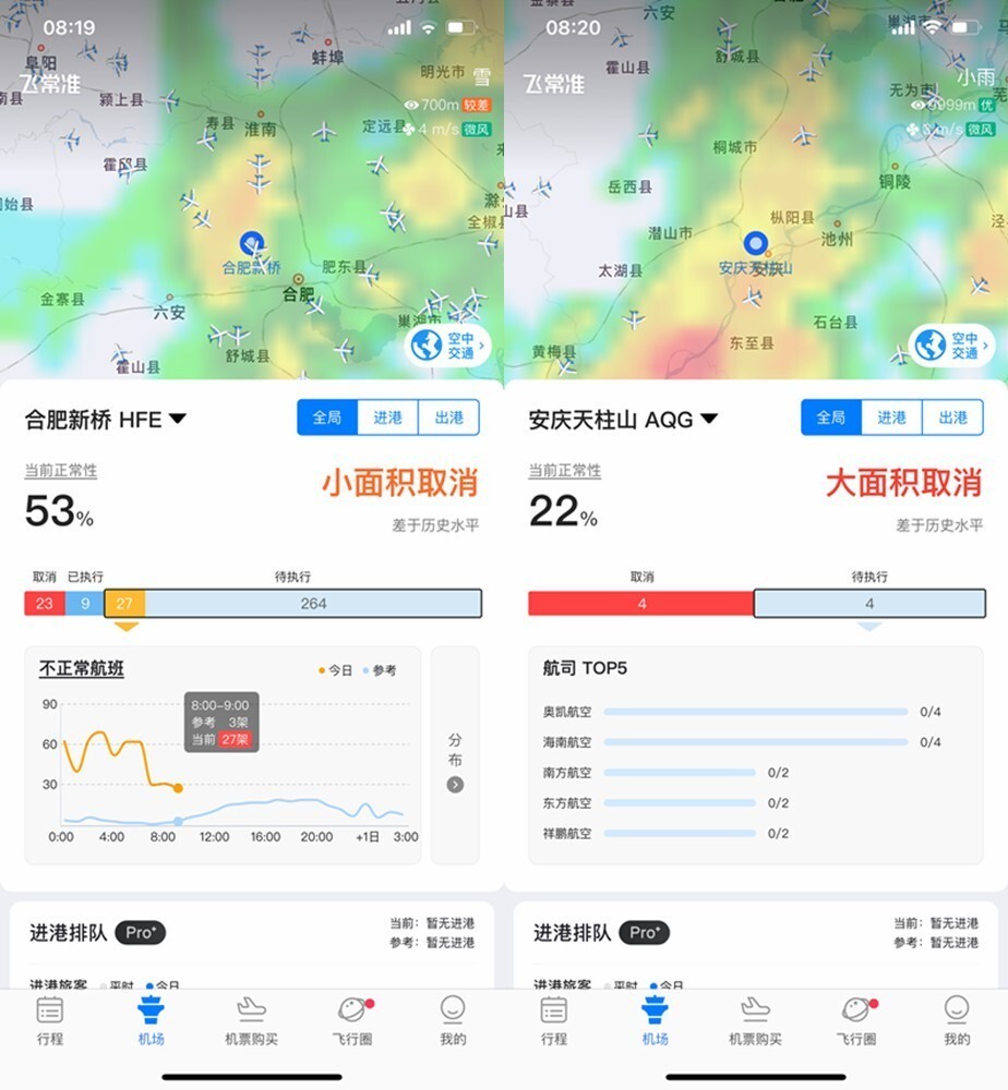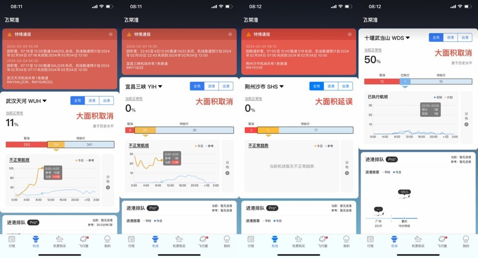 截至发稿,武汉天河机场、宜昌三峡机场、十堰武当山机场大面积取消,荆州沙市机场大面积延误。此外,合肥新桥机场小面积取消,安庆天柱山大面积取消。