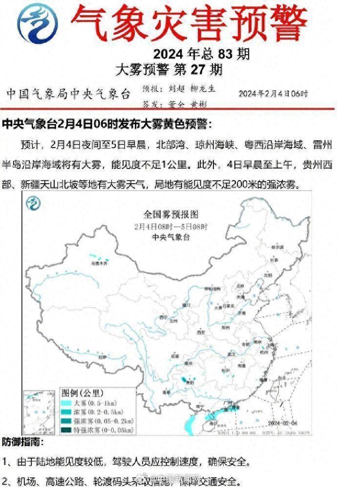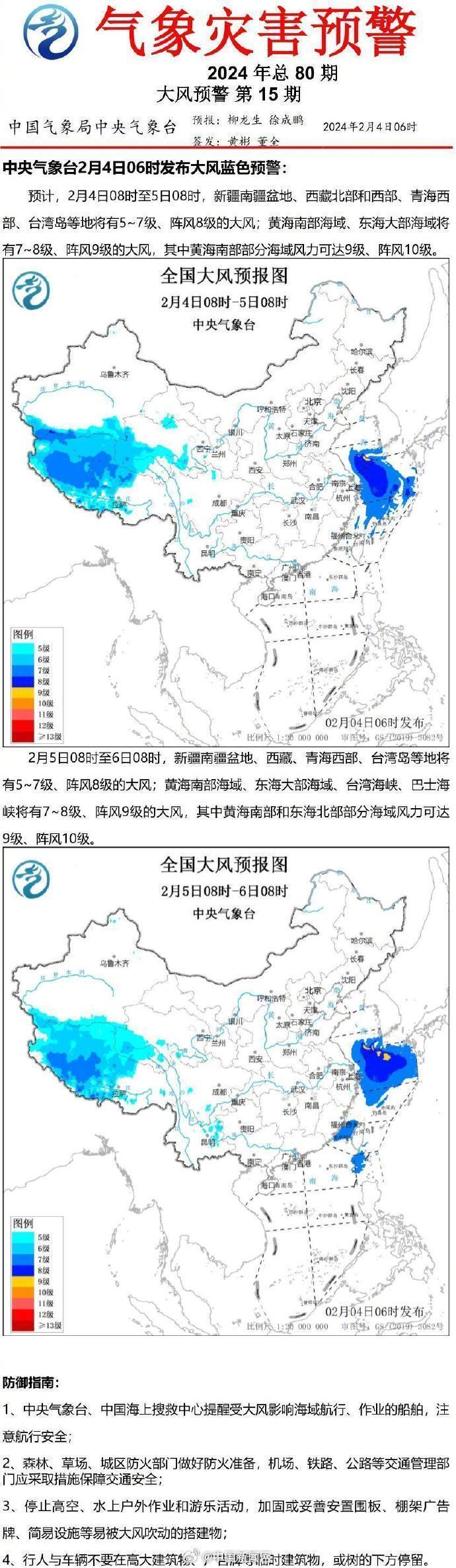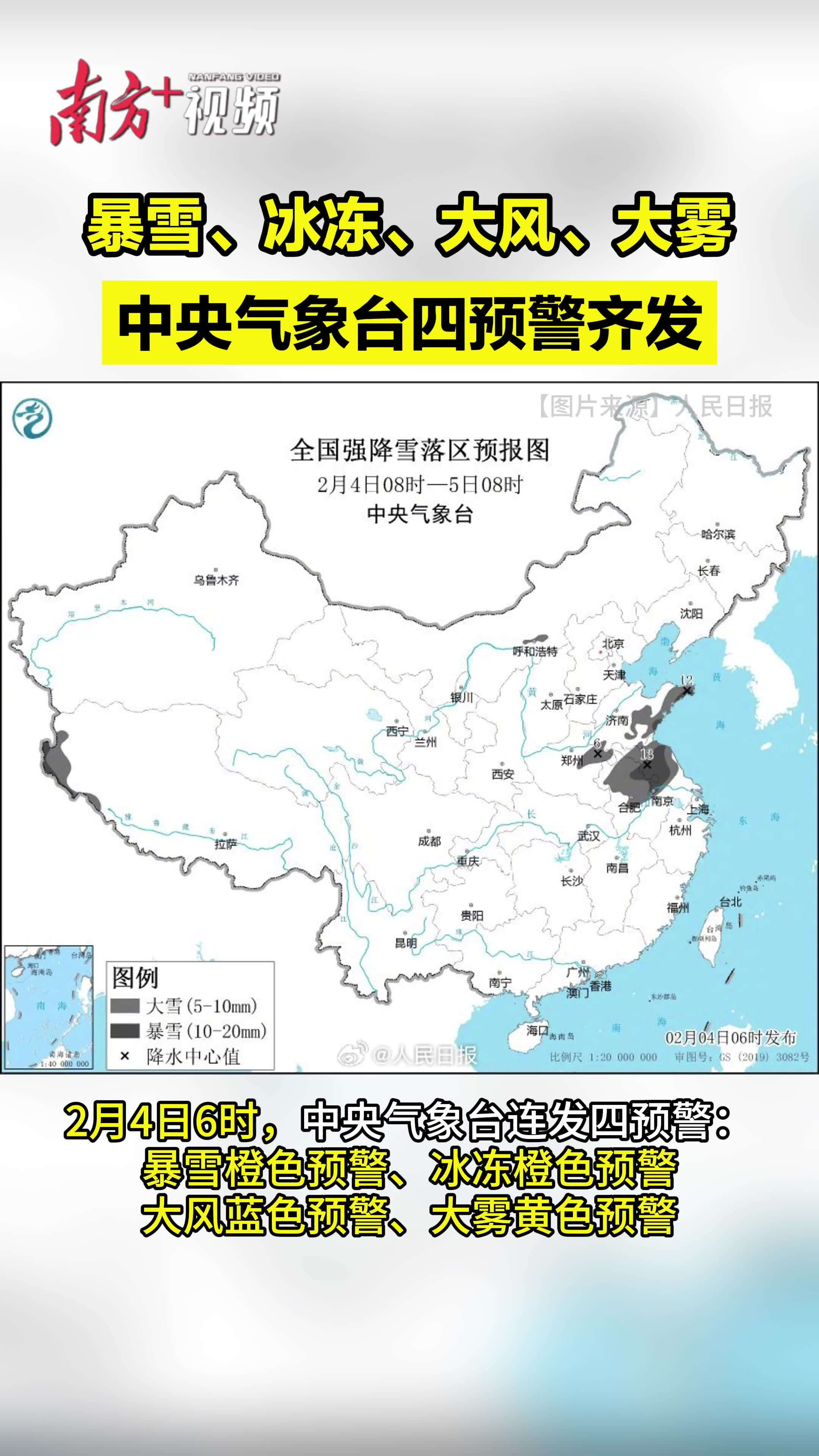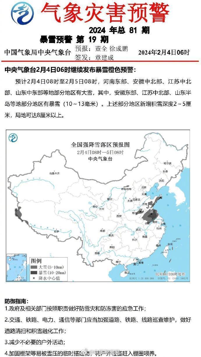 中央气象台2月4日06时发布大风蓝色预警、大雾黄色预警,继续发布暴雪橙色预警、冰冻橙色预警。