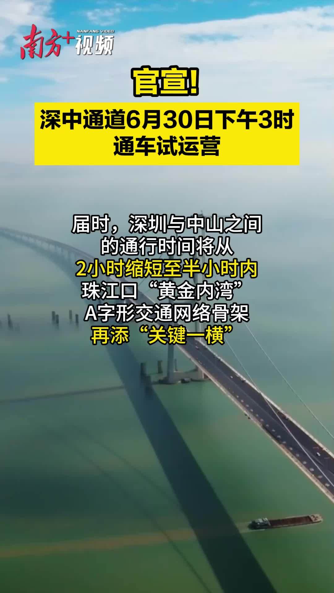 会上透露,深中通道预计6月30日正式开通,上午举行通车活动,下午3时通车试运营。届时,深圳与中山之间的通行时间将从2小时缩短至半小时内,珠江口“黄金内湾”A字形交通网络骨架再添“关键一横”。
