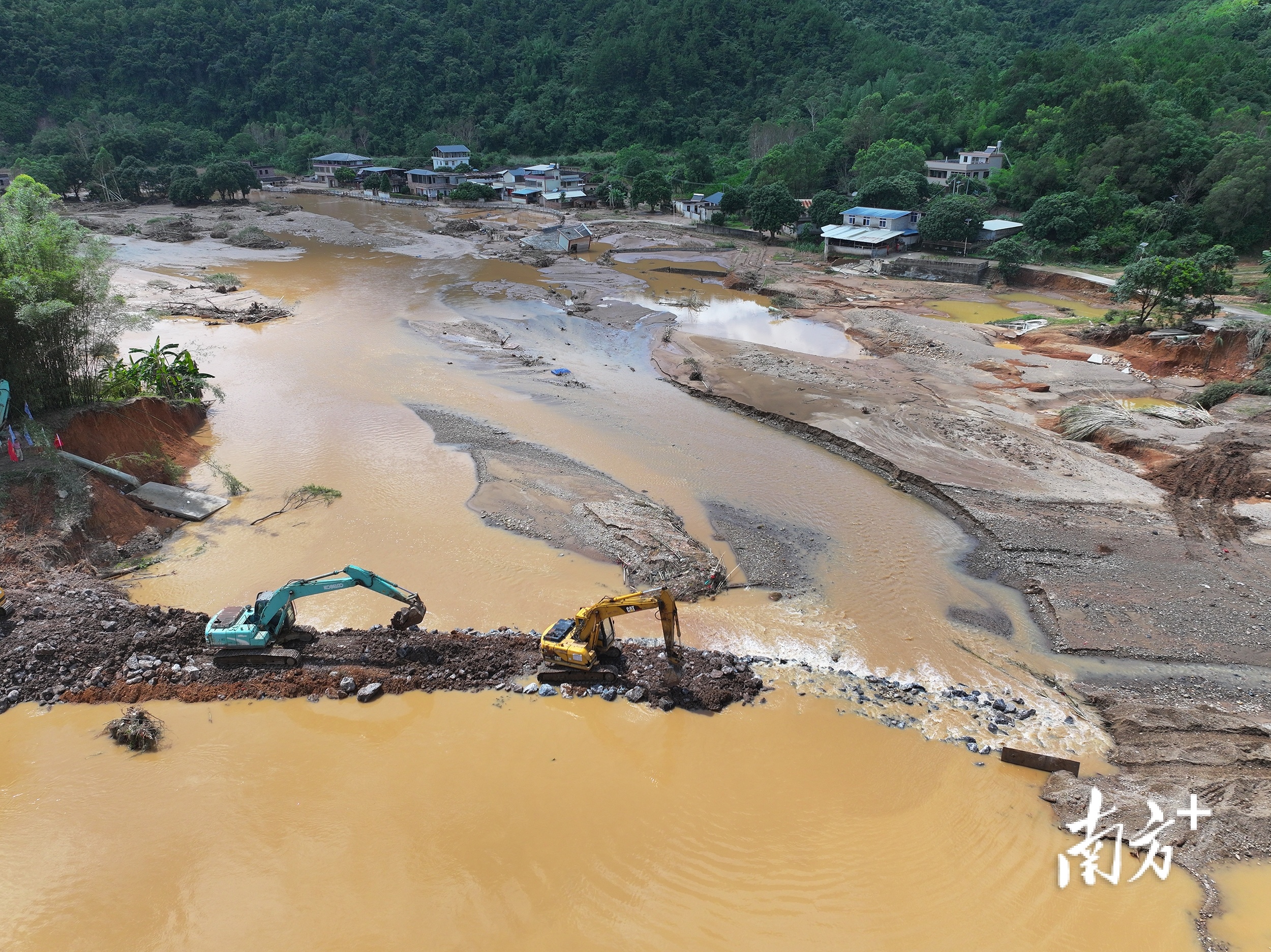 洪水退去后,6月18日上午,在当地紧急求援下,广东建工支援十余台挖掘机、重卡车等装备到场支援。