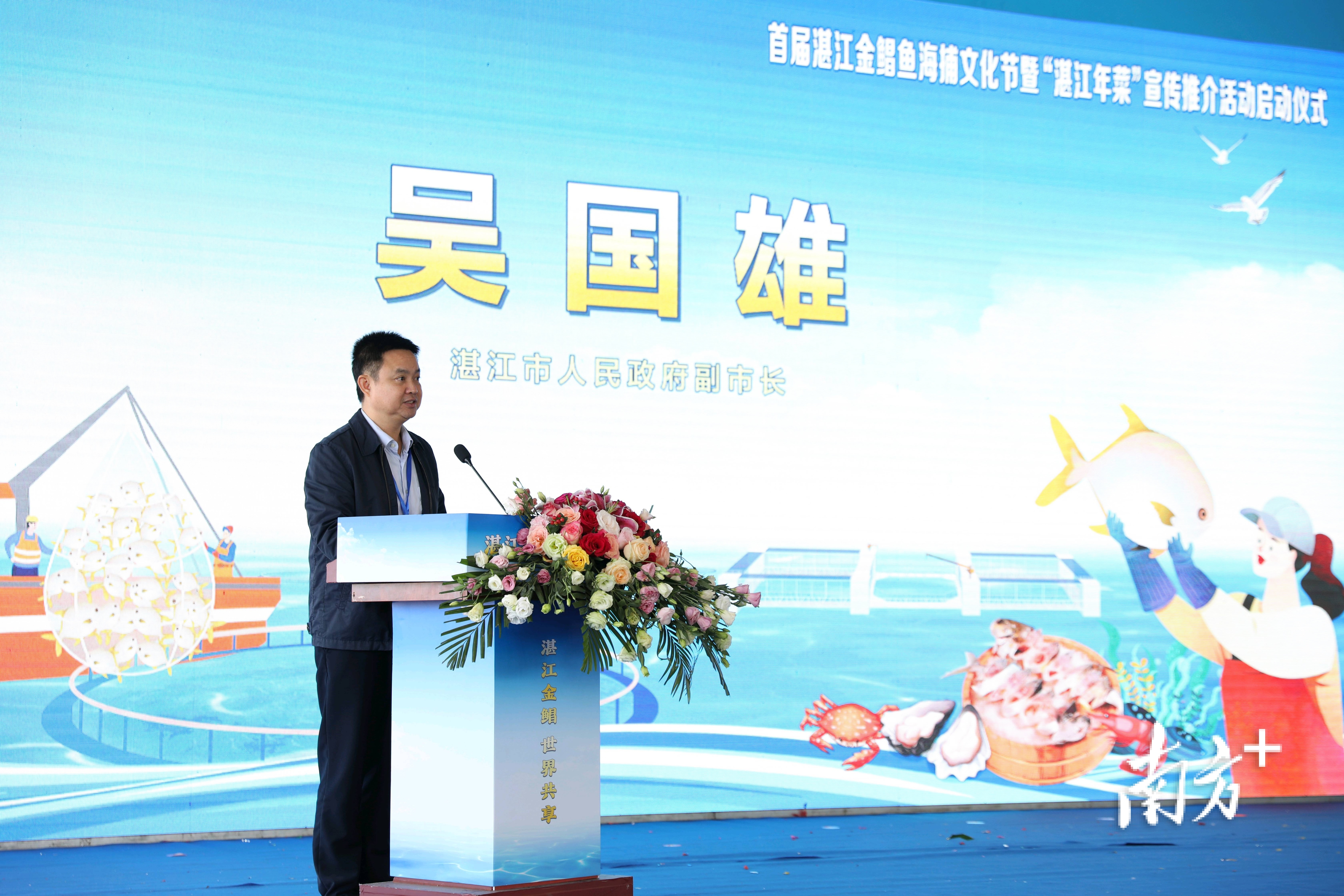 活动现场,吴国雄致辞。他表示本次活动以“湛江金鲳 世界共享”为主题,通过线上线下共同推动,必将进一步扩大湛江金鲳鱼及多种优质海产品的市场影响力,擦亮“湛江海鲜”金字招牌。湛江响应“年菜经济”号召,以2023年湛江年夜一桌菜发布为契机,抓住年底食品旺销时机,吹响湛江年菜营销号角,将湛江年菜端上千家万户餐桌,让世界人民共享湛江水产业高质量发展的成果。
