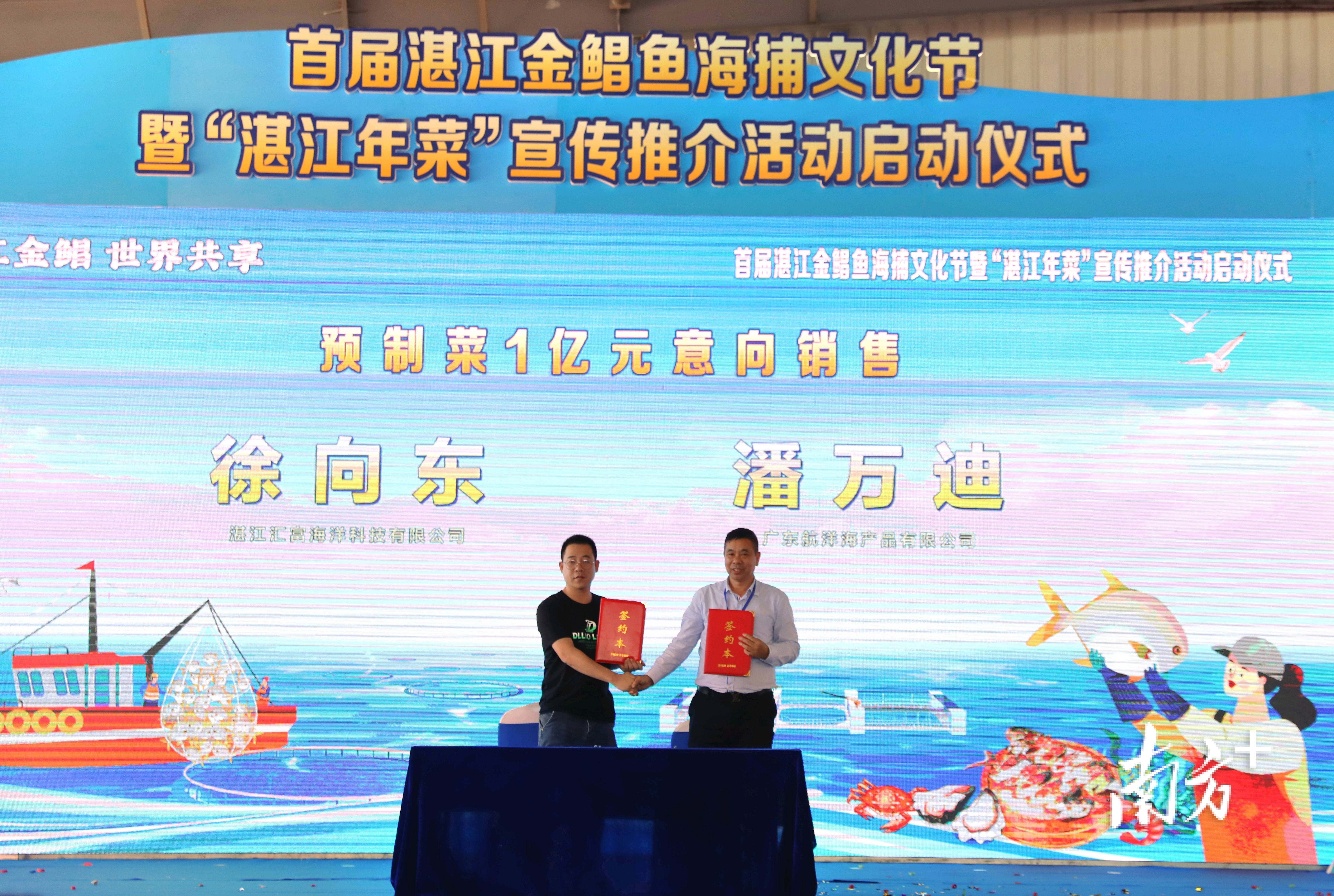 湛江汇富海洋科技有限公司和广东航洋海产品有限公司进行《湛江水产品预制菜100000000(一亿)元采购项目》签约;湛江富洋水产有限公司和北海市绿宝食品有限公司进行《湛江金鲳鱼60000000(六千万)元采购项目》签约;廉江市山稔花旅游投资开发有限公司和广西粤供农产品有限公司进行《湛江市农副产品采购项目》签约;湛江岭粤水产养殖有限公司和麻章区太平镇岭头经济联合社进行《发展南美白对虾养殖基地建设项目》签约。