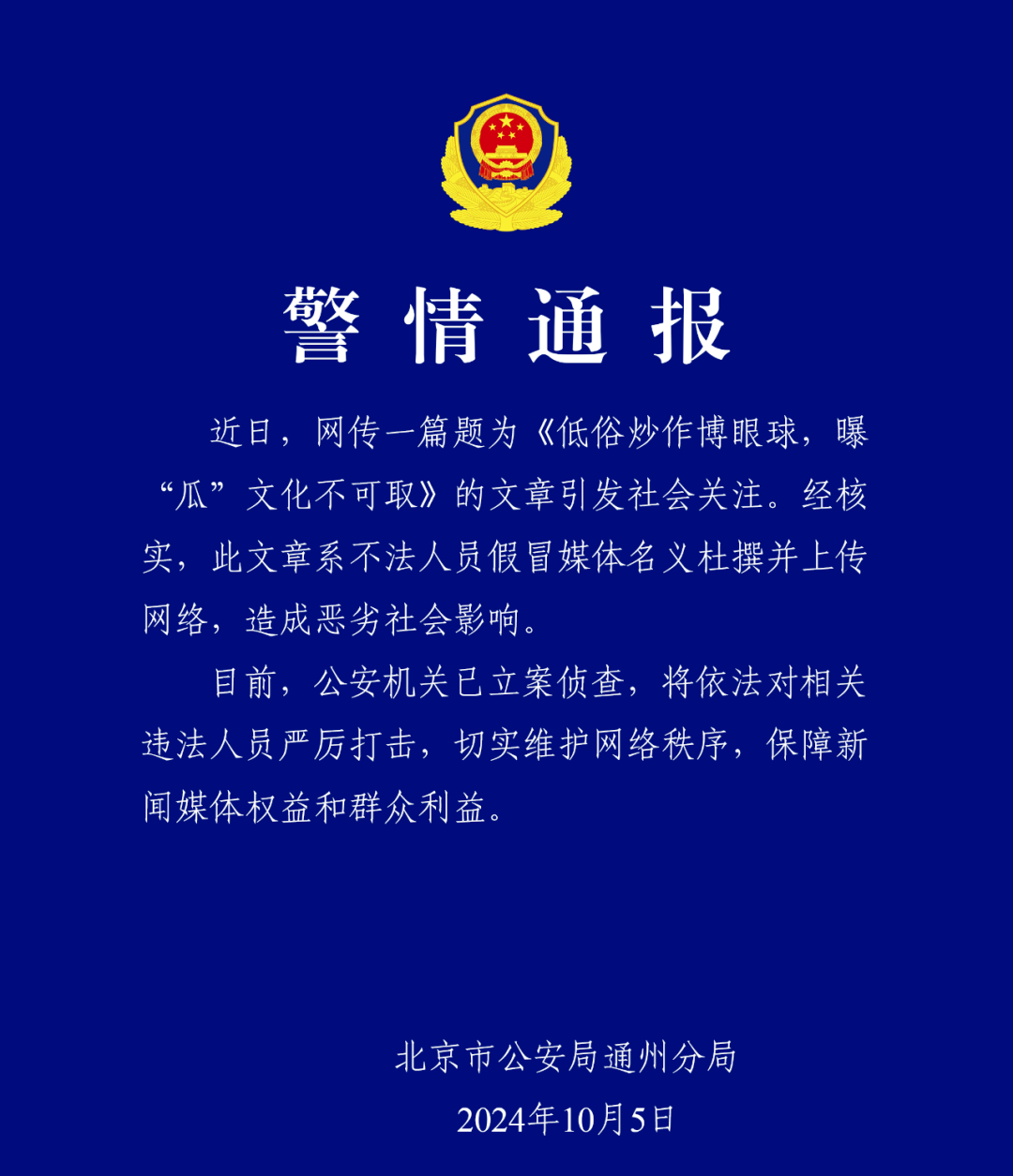 10月5日23时许,北京市公安局通州分局通报: