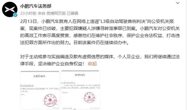 小鹏汽车:造谣“L3级自动驾驶首例判决”的主要嫌疑人已到案