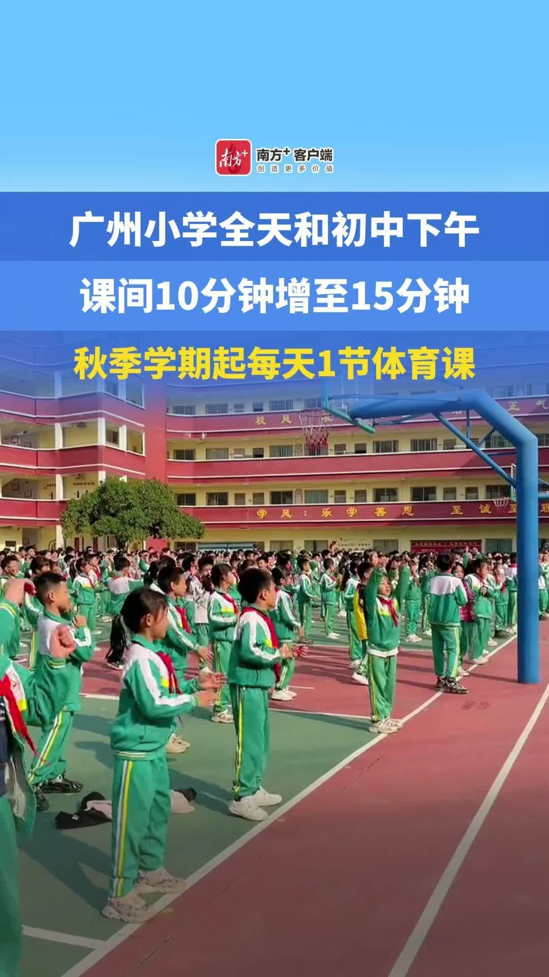 从2025年春季学期开始,广州小学课间10分钟调整为15分钟,初中下午课间10分钟调整为15分钟。从2025年秋季学期开始,广州市义务教育阶段学校100%落实每天1节体育课。详情>>