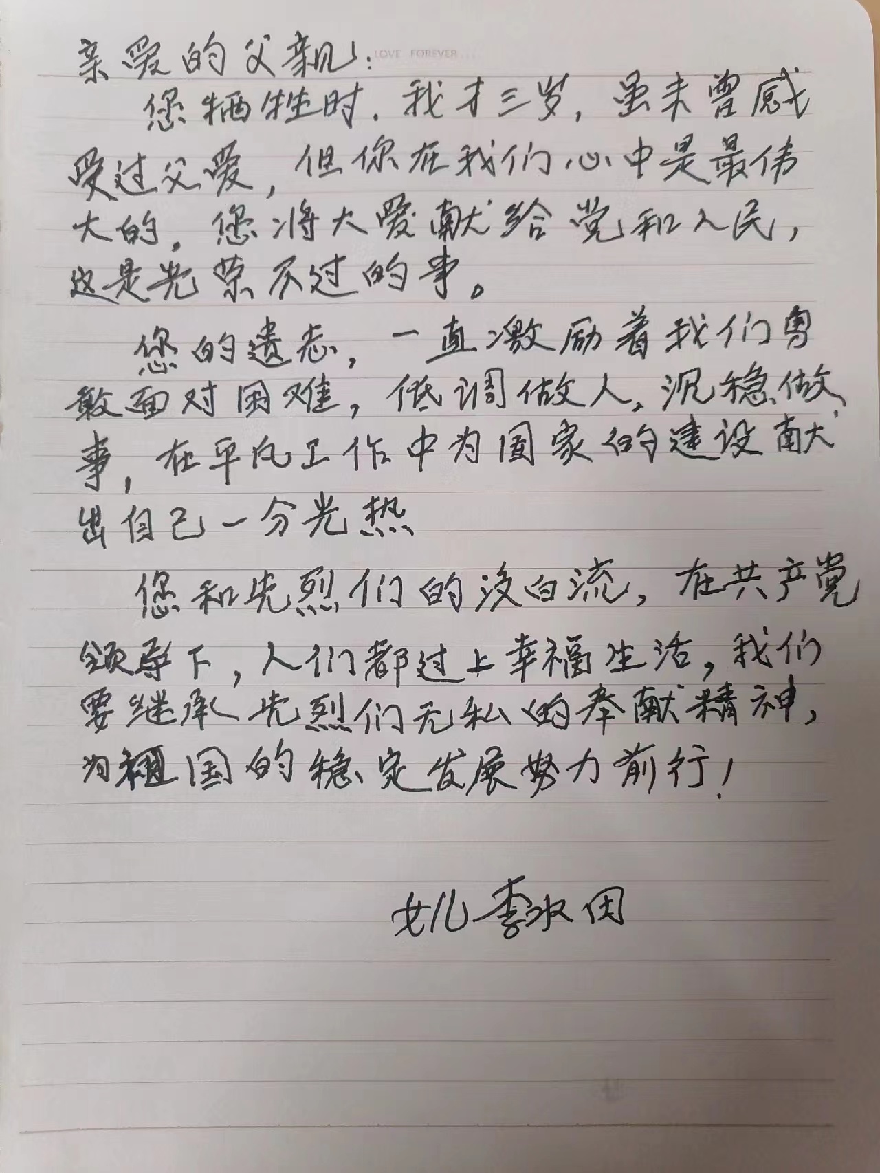 在女儿李水田3岁时,烈士李卡英勇牺牲。女儿在家书中写道:虽未曾感受过父爱,但你在我们心中是最伟大的,您将大爱献给党和人民!