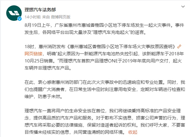 理想汽车法务部消息,8月19日上午,广东省惠州市惠城香榭园小区地下停车场发生一起火灾事件。事件发生后,各网络平台出现大量涉及“理想汽车充电起火”的谣言。