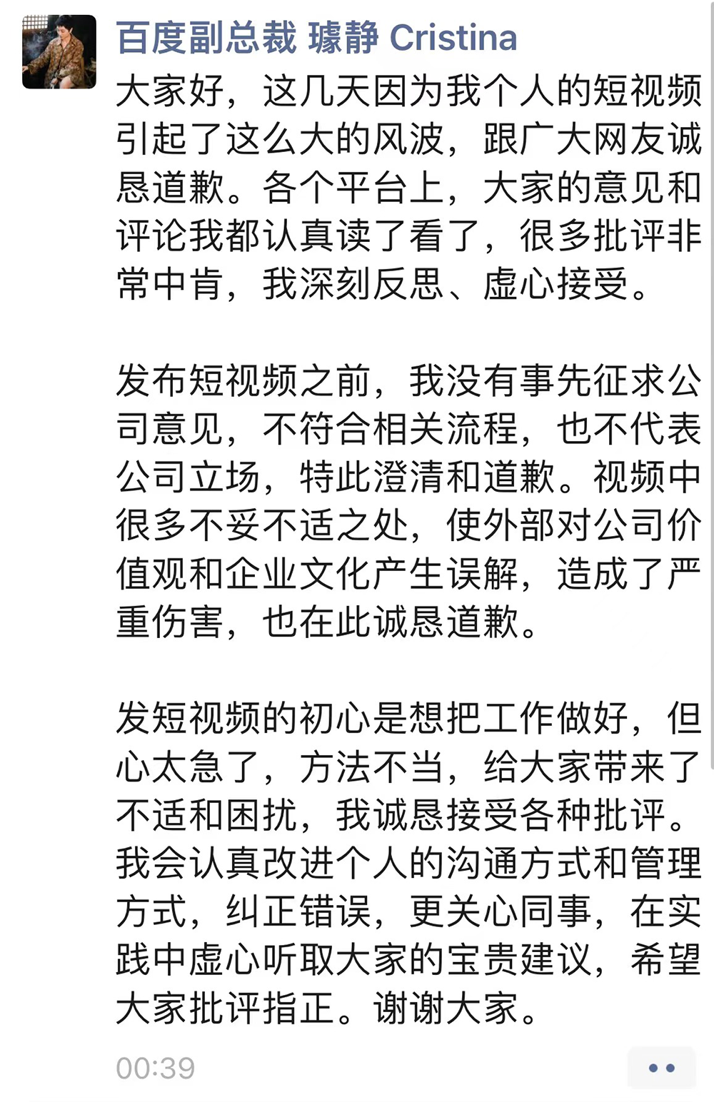 5月9日凌晨,百度副总裁璩静在朋友圈发文称,因个人短视频引起风波,跟广大网友诚恳道歉,“各个平台上,大家的意见和评论我都认真读了看了,很多批评非常中肯,我深刻反思、虚心接受。”