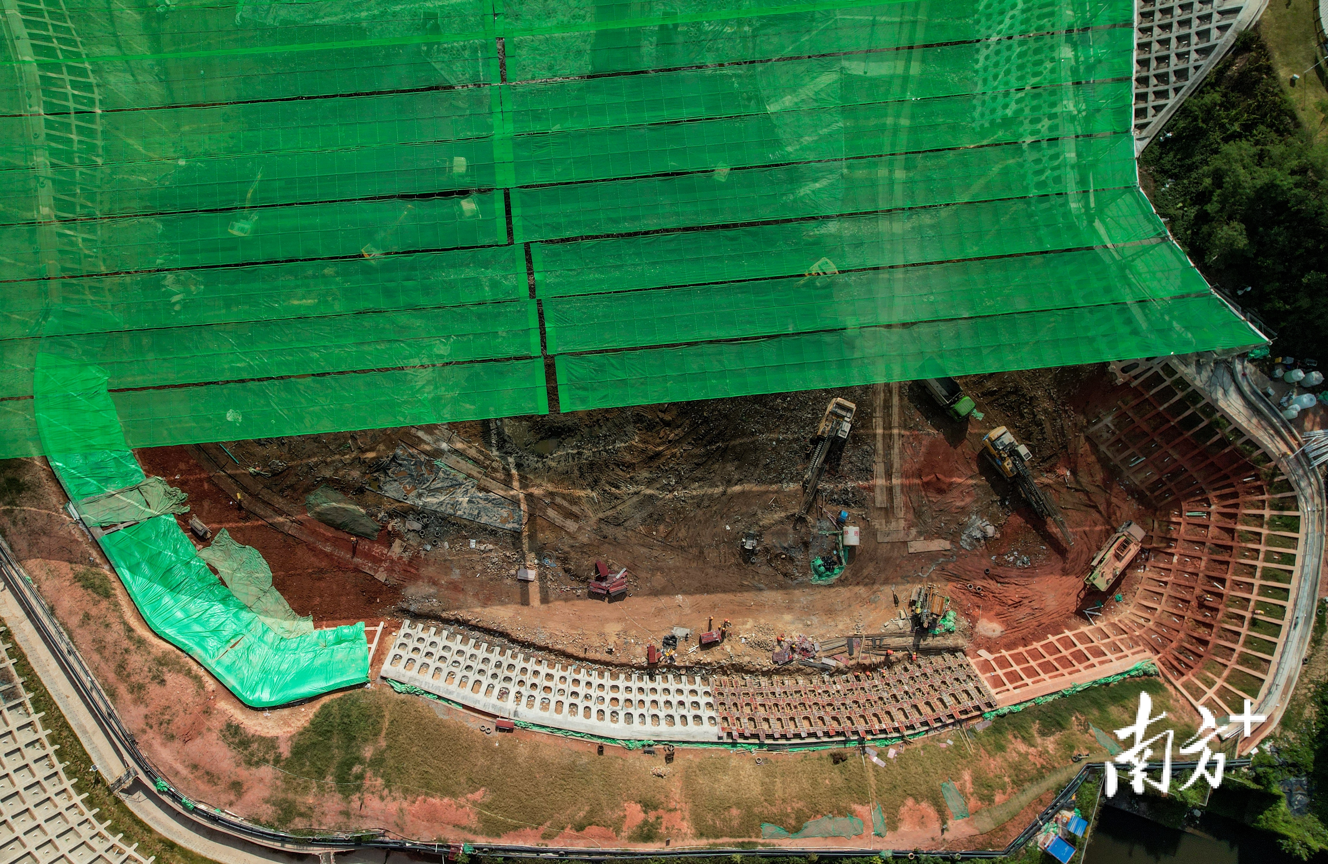 从高空俯瞰,这张巨大的绿色防尘布将作业区覆盖起来,宛如披上了一层特制的“手术衣”。罗湖区城市管理和综合执法局相关负责人介绍,这是国内最大的天幕系统,覆盖面积达11.69万平方米、最大跨度约280米,集成降尘、除臭与视觉阻隔功能,在敏感城区环境中符合最高的环保标准要求。