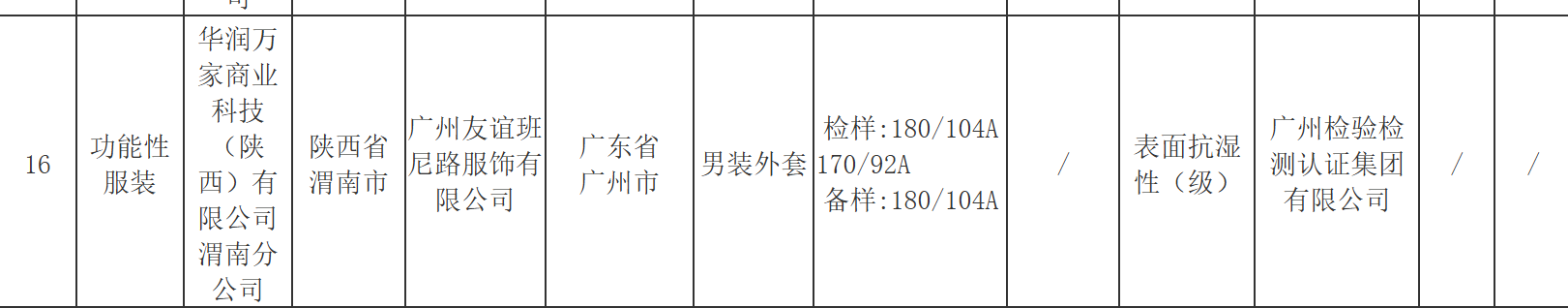 抽检结果显示,标称华润万家商业科技(陕西)有限公司渭南分公司受检的一款男装外套(检样规格型号:180/104A;170/92A)被检出不合格,不合格项目为表面抗湿性(级),生产企业为广州友谊班尼路服饰有限公司。
