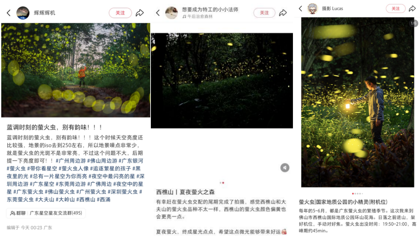 ①观赏拍摄时请勿打灯开灯。可使用红光手电筒,以减少光线对萤火虫的干扰。